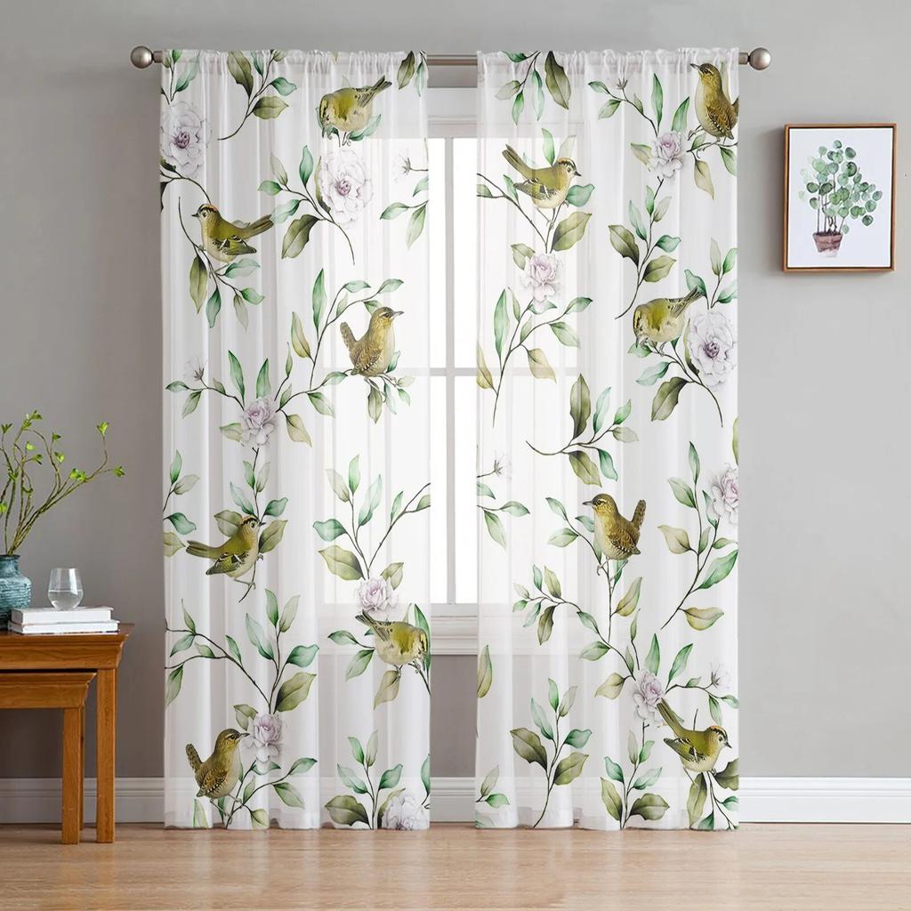 Plants Flowers Watercolor Birds Tulle Curtains for Living Room Sheer Curtain for Bedroom Kitchen Blinds Voile Curtains