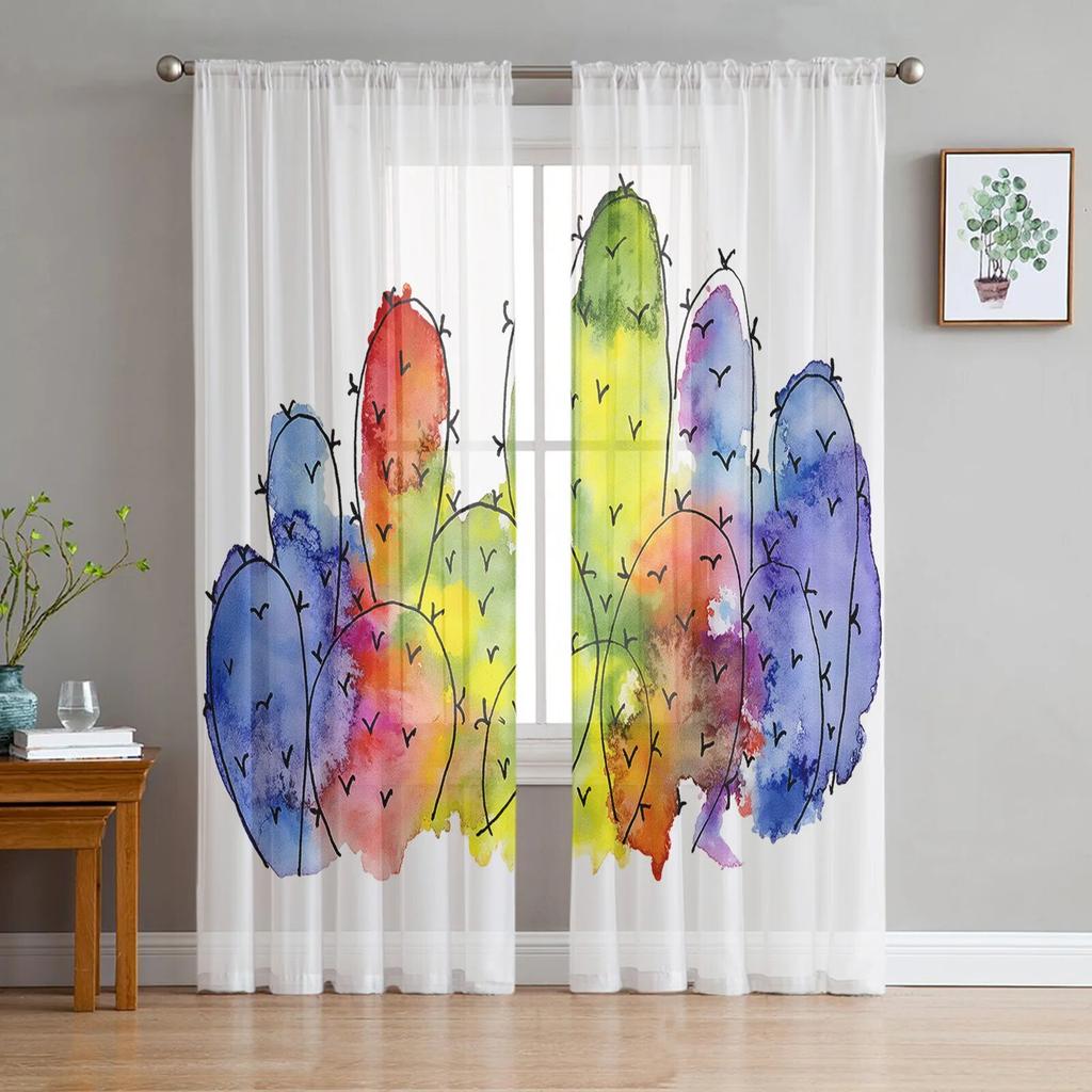 Watercolor Lines Cactus Chiffon Sheer Curtains For Living Room Home Decoration Window Voile Tulle Curtain Drapes