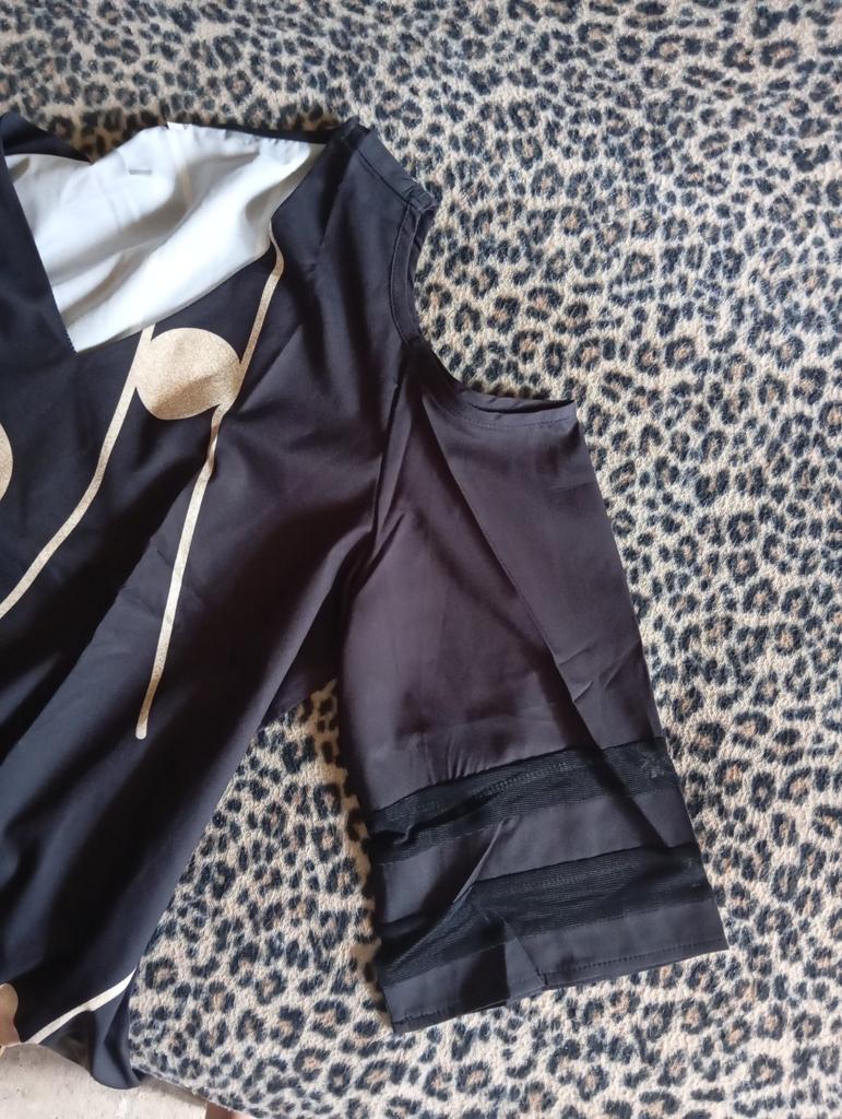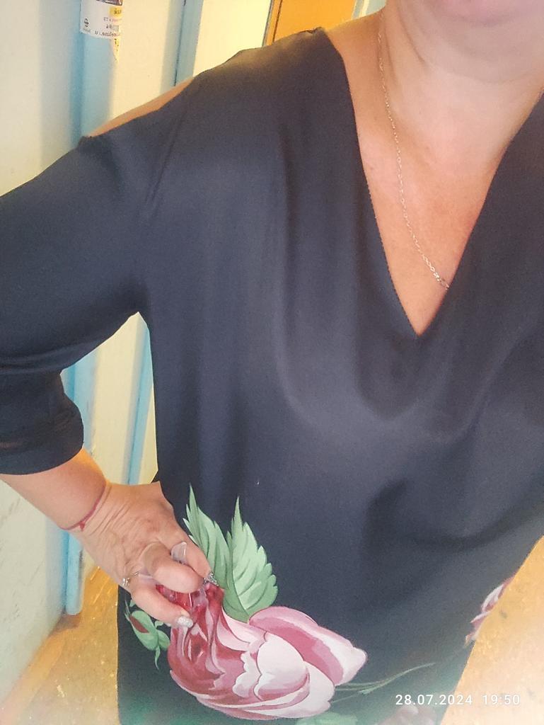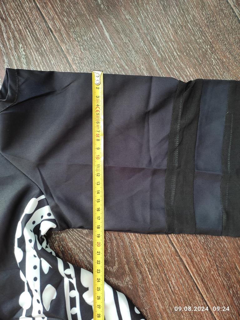 Not at all like in the photo. It’s narrow in the chest and hips, and at the opposite waist it’s like a bag. The fabric is very thin and silky. The inserts on the sleeves are made of black fine mesh, not transparent as in the photo. The sleeves themselves are narrow