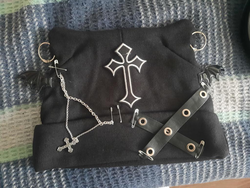 Punk Cat Ear Hat Cross Chain Wool Hat Autumn and Winter Warm Cat Ear Subby Hat