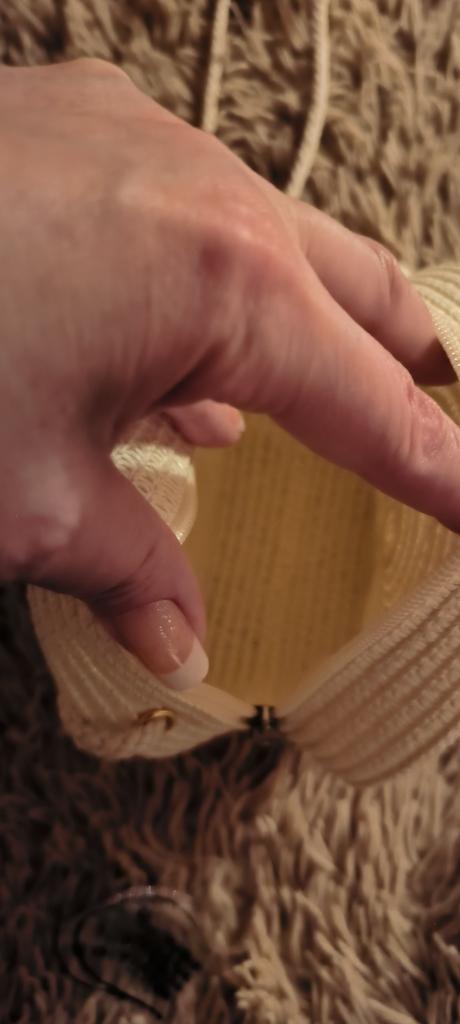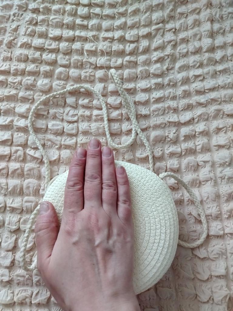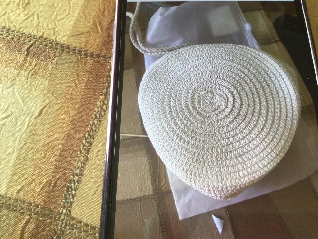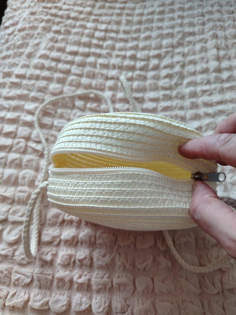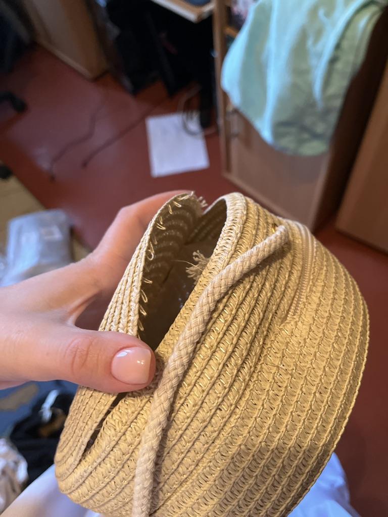 A thin little handbag. For its money, it's quite good. Everything is intact. No threads are sticking out.