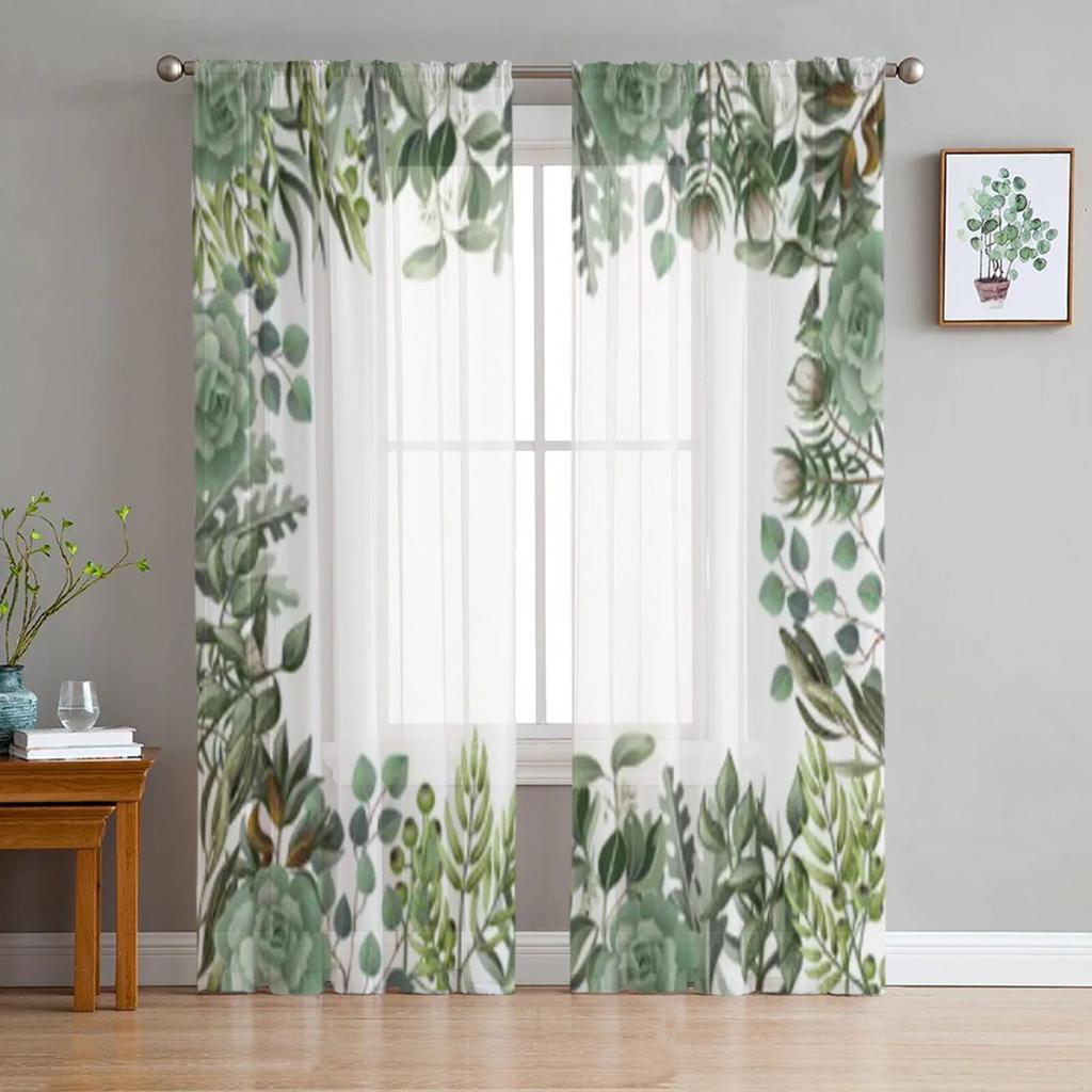 Leaves And Succulent Watercolor Style Sheer Curtains For Living Room Kids Bedroom Tulle Curtains Kitchen Window Treatment Drapes