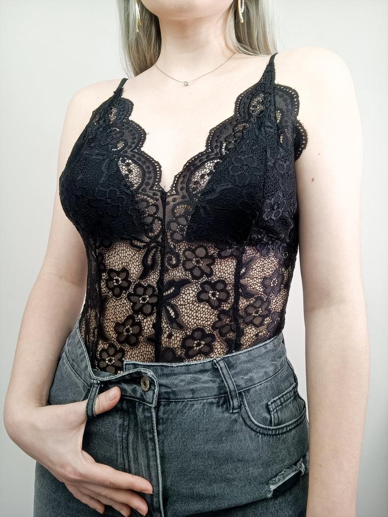 Sexy body with lace. 🩱 Delivery time 🌞: 33 days to Germany. ♻️Scope of delivery: The delivery includes a very sexy bodysuit🩱 in the appropriate size. The product is only available in black in sizes S to XL. I ordered the product in size S and it fits me OK, a bit big. The color is exactly as shown. 🤗🤗🤗👍I should have ordered a size smaller. I followed the manufacturer's size chart, but I can also wear S with shorts in this case. I normally wear a size 36 (S). I weigh 55kg and am 167cm tall. 👍👍💥💣. Cup size 75B. 🌞Quality ♻️: The body is opaque on the chest area and the bottom, which I think is great 👌. That's why I don't wear a bra underneath. There is a very deep neckline 😀. Unfortunately it is too deep and big for my chest. (( Material composition: 95% Polyester, 5% I think the product is beautiful 🔝🔝🔝🔝🔝 . Perfect for a club or a romantic evening 😀👌👌👌 Unfortunately it's a bit big for me. But there is no smaller size, which is a shame. It would be great if the body had a push-up effect. Then it wouldn't be too big. ✳️Summary ✳️: A beautiful bodysuit 🩱 that you have to order in your normal size or preferably one size smaller. I would be happy to recommend the product. 5 stars. 🌟! Thank you Joom and the seller Hi Dawn!🙏