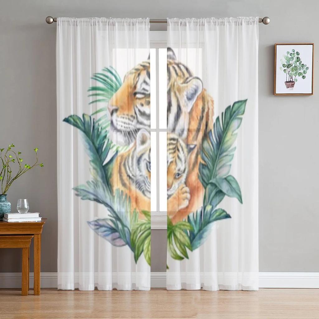 Tigers Tropical Green Leaves Chiffon Sheer Curtains For Living Room Bedroom Decoration Window Tulle Curtains Drapes
