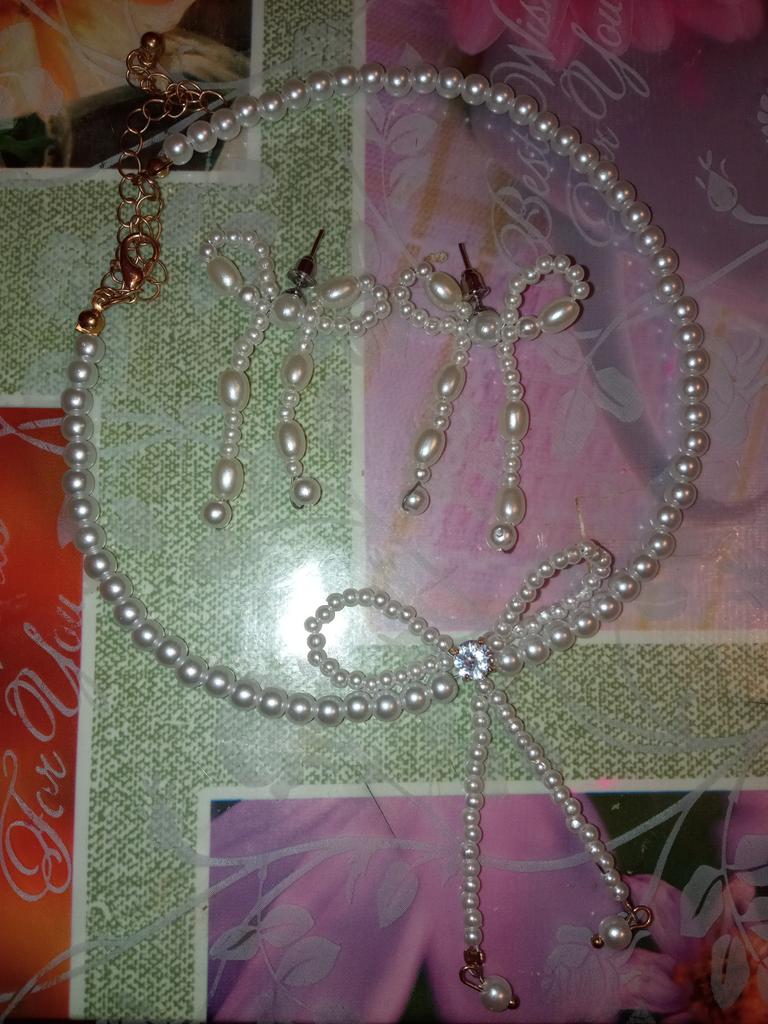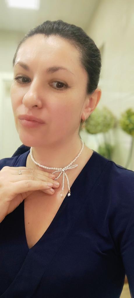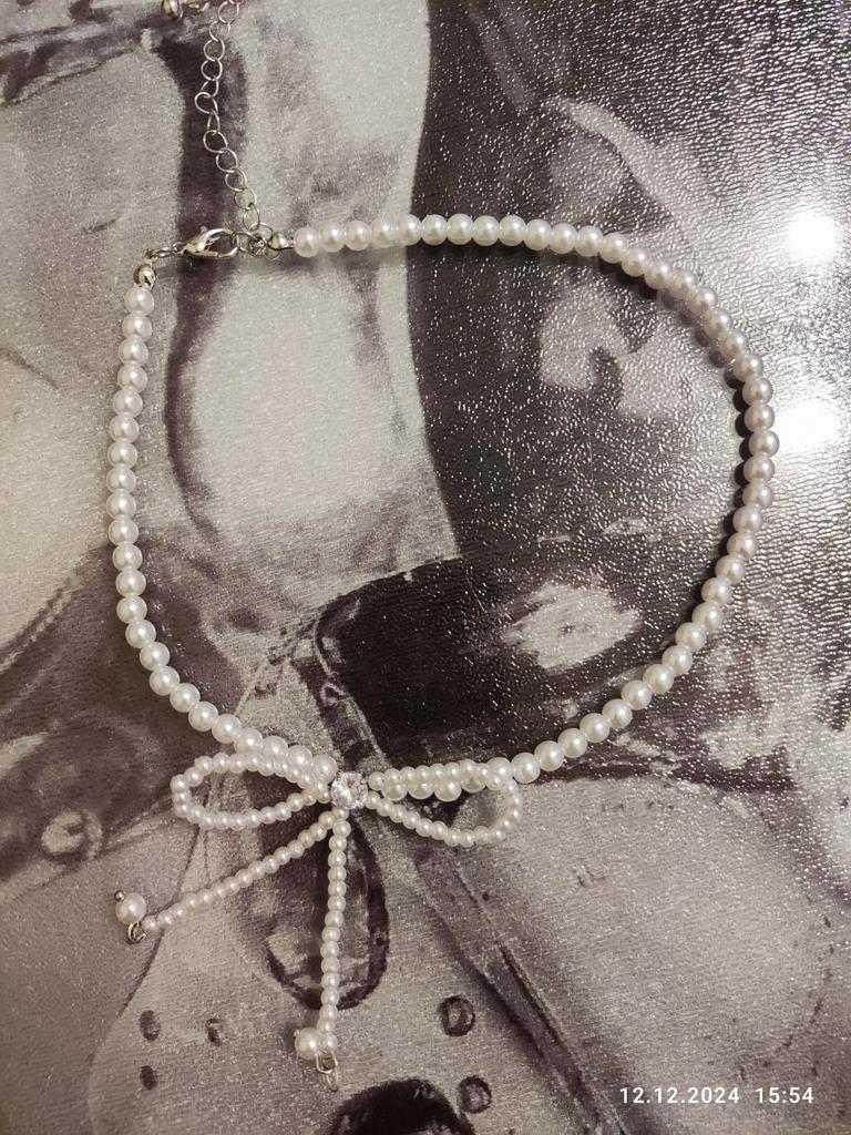 🤍🎀Delicate, elegant necklace! 🎀Silver fittings . 🎀Length with chain 42 cm 🎀Length of pearl row 31 cm 🎀There is a stone in the middle of the bow! 🎀Decent, beautiful jewelry! 🎀With both hands for this product!