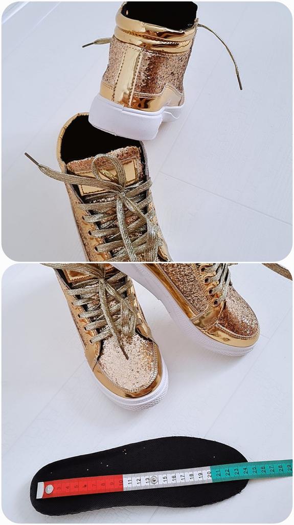 Beautiful sequin platform sneakers, casual shoes👟! Delivery time: 🚚🚛✈️✈️✈️14 days to Germany. Scope of delivery: The delivery includes a pair of beautiful platform shoes for women in the appropriate size and color. There are shoes in 3 different colors to choose from . The product is available in sizes 38 to 48 . I ordered the shoes in size 38 in gold and they fit me perfectly. The shoes run small, so you have to order a size larger. The color of the shoes is exactly as shown.👍👍👍👌👌👌❗️ I normally wear shoes in size 37. My foot length is 23.8 cm. These 👟are ideal for me👍! They are very, very light and comfortable, seem to be well made and don't have an unpleasant chemical smell. I don't feel them on my feet at all.👌👌👌. TOP!!! I am really positively surprised by the quality of the shoes! I really like the design, especially the sequins 👍👍🔝, it looks extraordinary. 👍☝🏻 The product is ideal for everyday wear. I would even take it with me for hiking. ✅️❗️🔝🔝🔝. Summary: Very nice sneakers 👟, which you have to order a size larger. Thank you joom and the seller!😘😘🙏 5 stars 🌟 🌟 🌟🌟🌟
