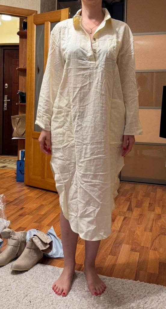 Suitable as a nightgown. Cotton. Natural. But not suitable as a dress. Very see-through, does not drape, does not fall off as in the photo, but stands upright, wrinkles. Very good as a nightgown.