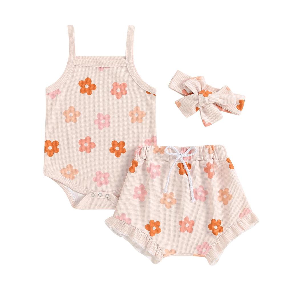 Baby Girl Summer Clothes Floral Print Sleeveless Romper and Ruffle Shorts Headband Set 3PCS Outfits