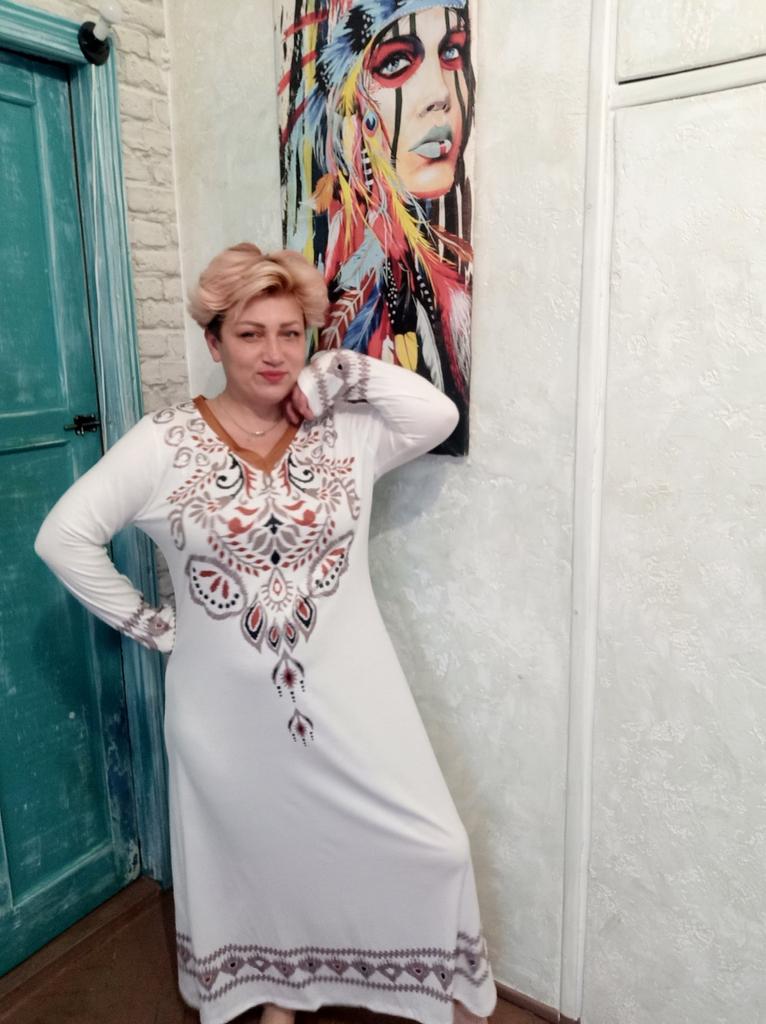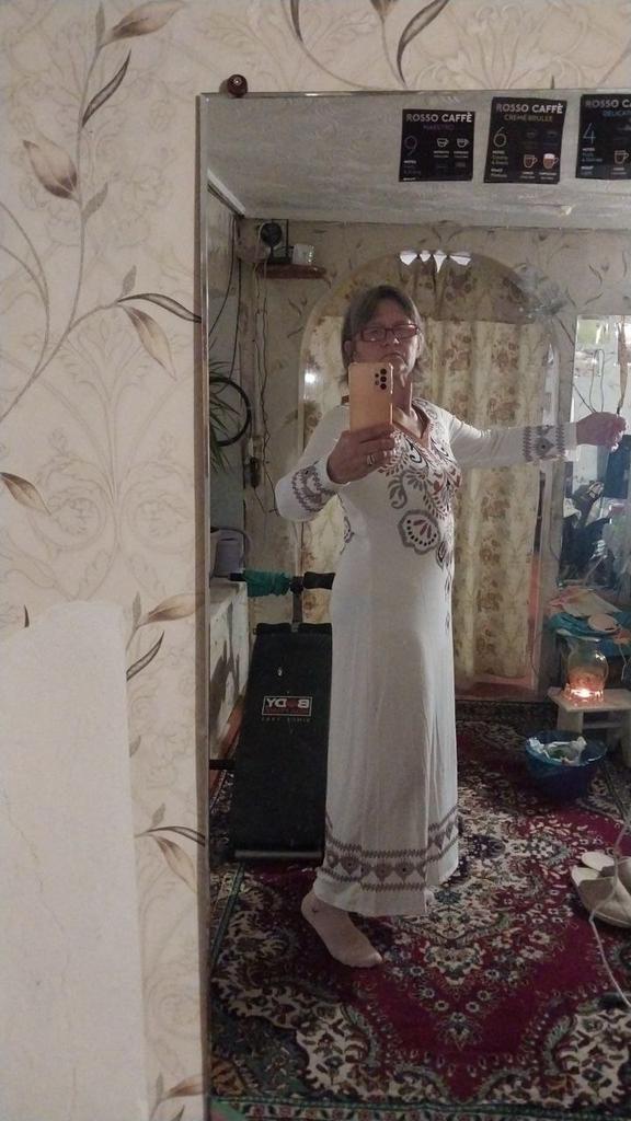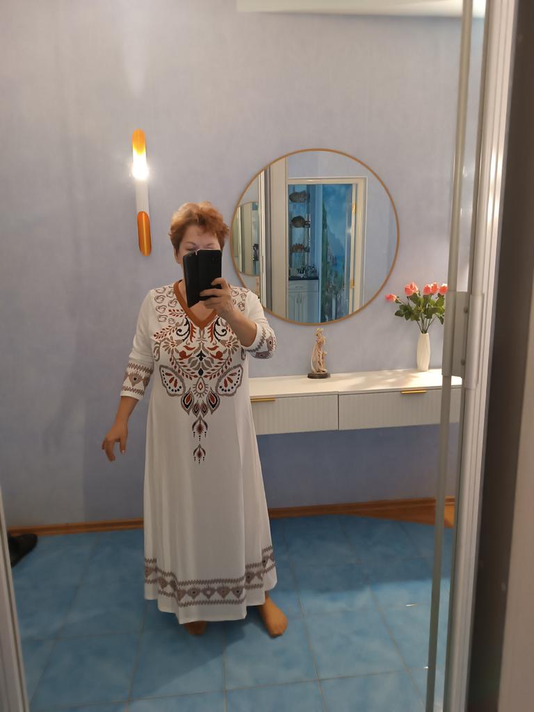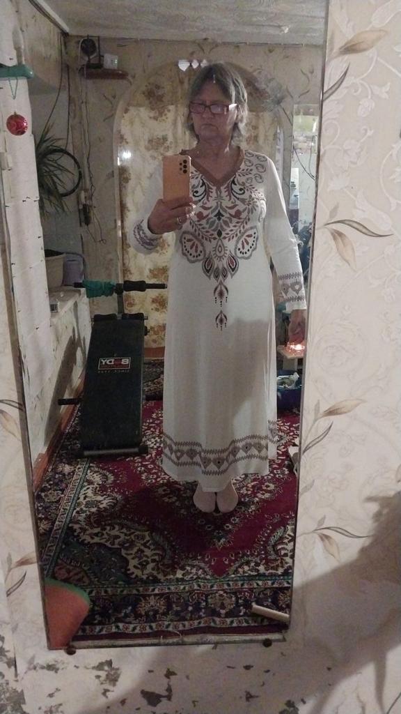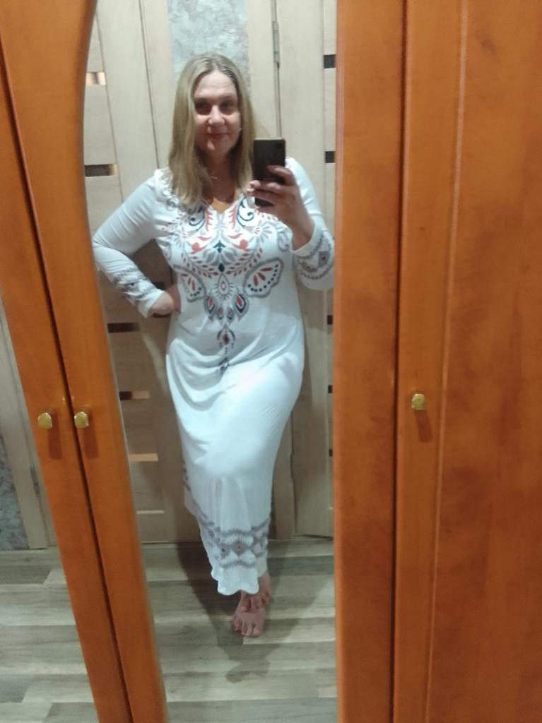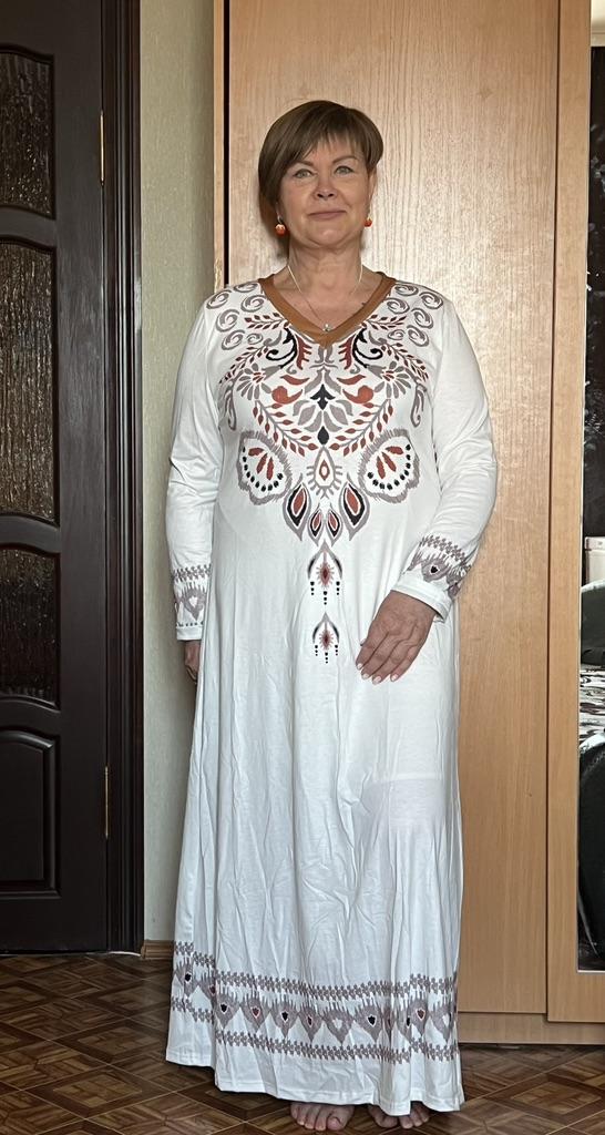 For my 50th, I bought 2XL, could have gone smaller, but knitwear - "all the folds" are visible. Sleeves are a bit long. Looking at the photo (and some comments), the dress seemed dressy to me, but it arrived faded. But the fabric is pleasant, I will use it as a nightgown.