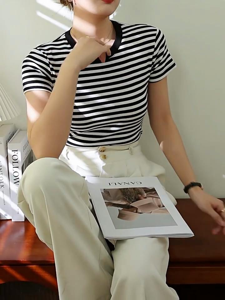 Striped T-shirt Women's Summer Short-sleeved 2024 New Pure Cotton Retro Top Slim Slimming Bottoming Shirt