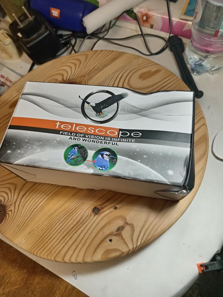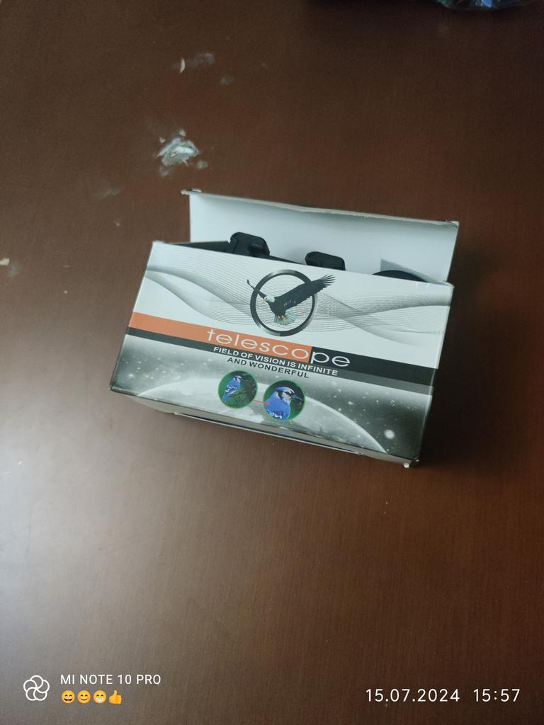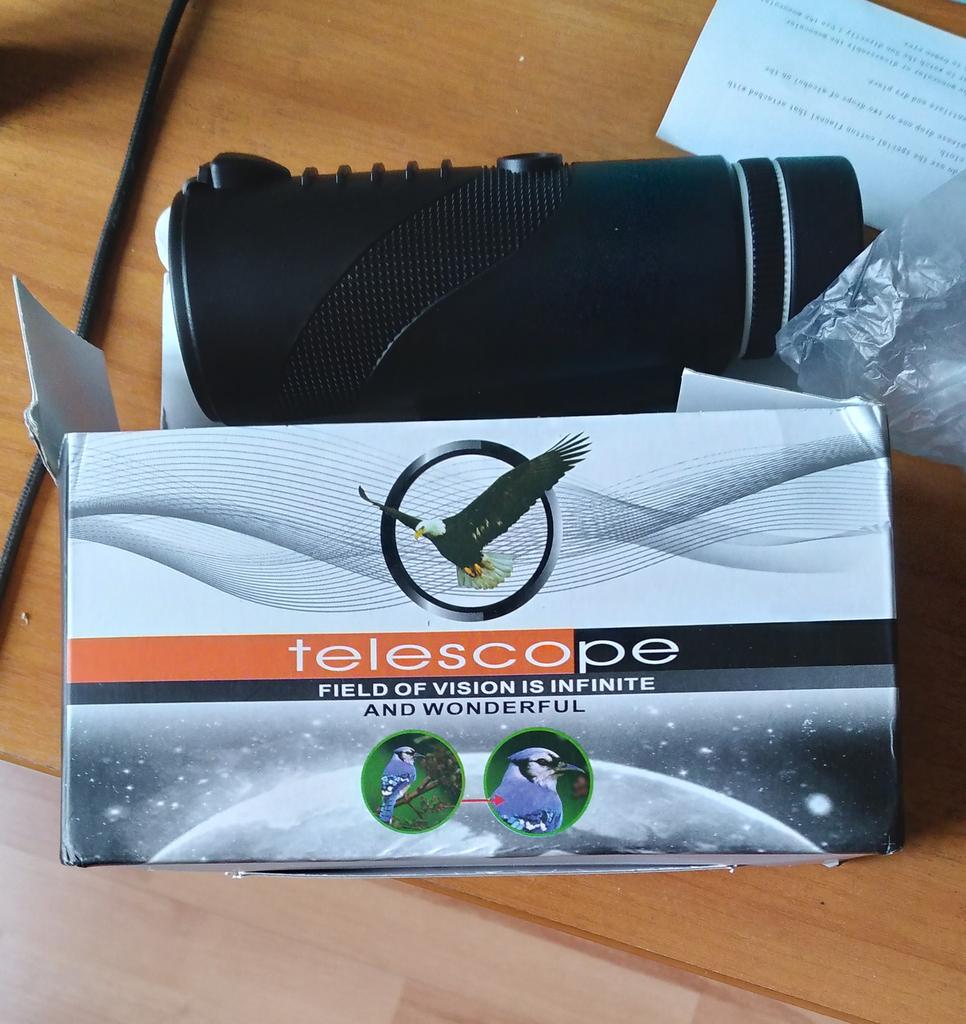 A toy that looks like a telescope. It arrived with a lens that had fallen out. There is no device for attaching it to a phone. There are aberrations in the red color. The magnification is barely noticeable, exactly what it is is unclear but no more than x3. The focus wheel is marked 80x100. Ha ha ha. In the catalog photo, the lens was drawn much larger than the real one and bright green. In reality, the lens is about 1.5" (34-36 mm) and not green. At a certain angle of view, it glitters green, apparently there is a green filter in the body.