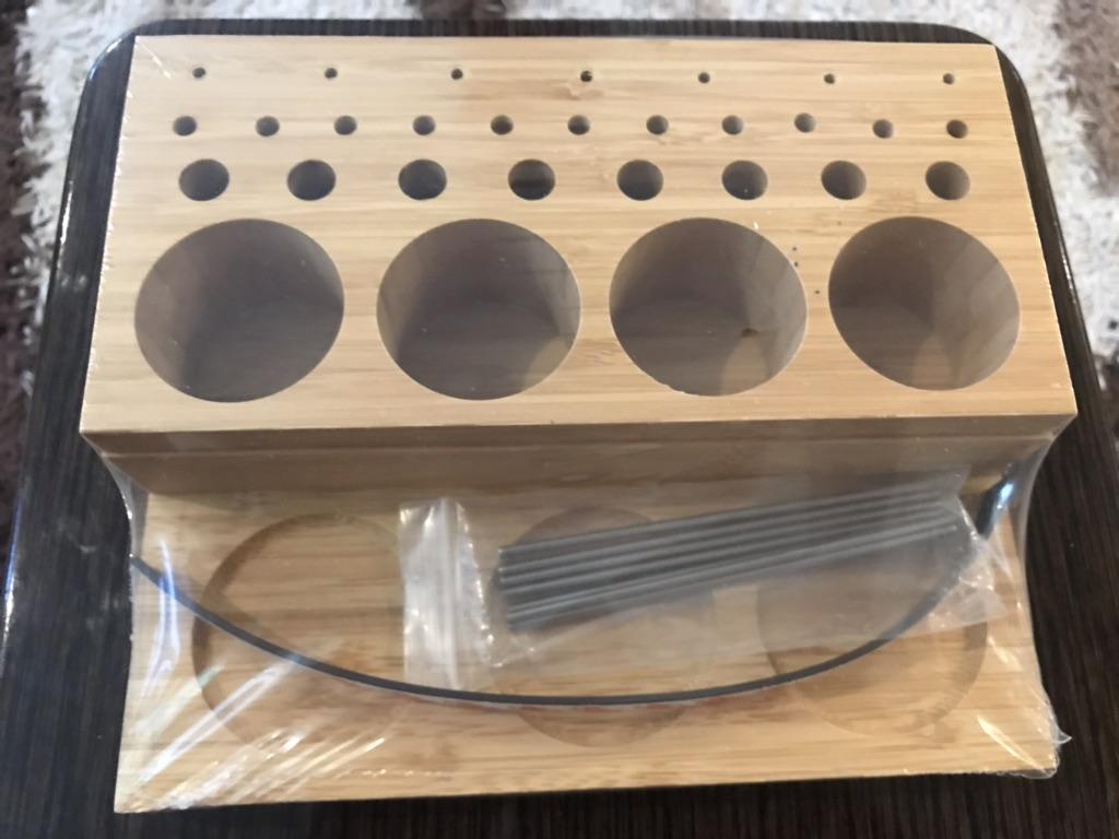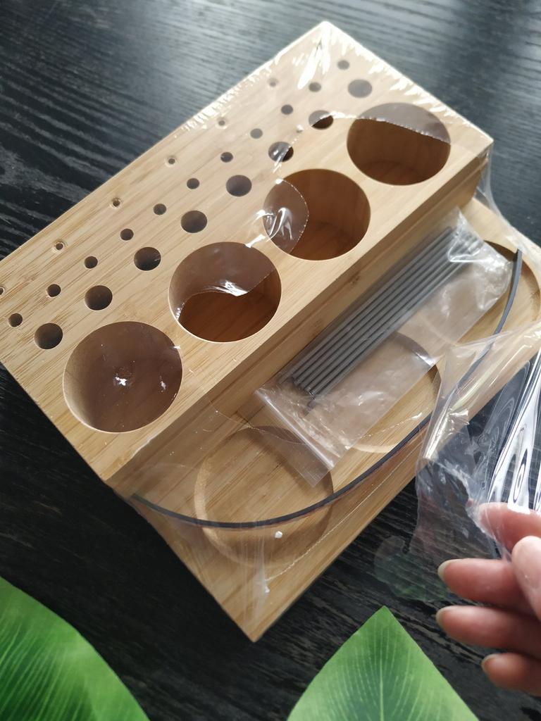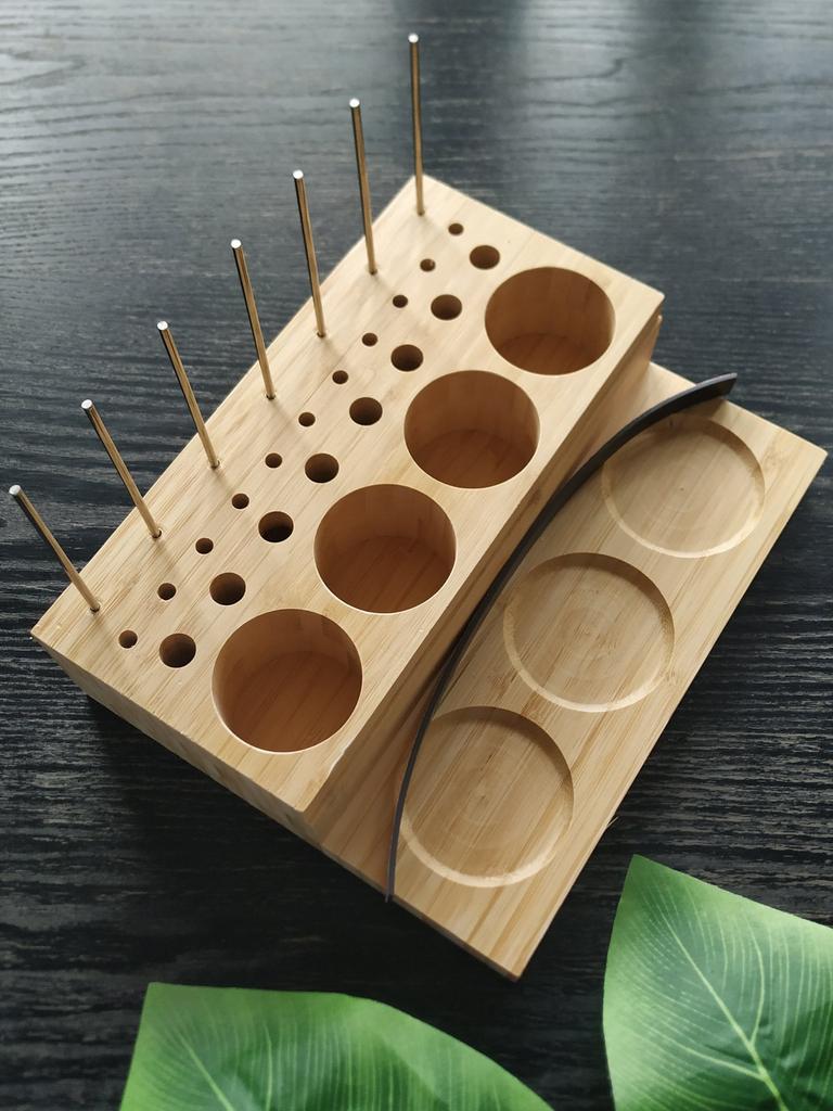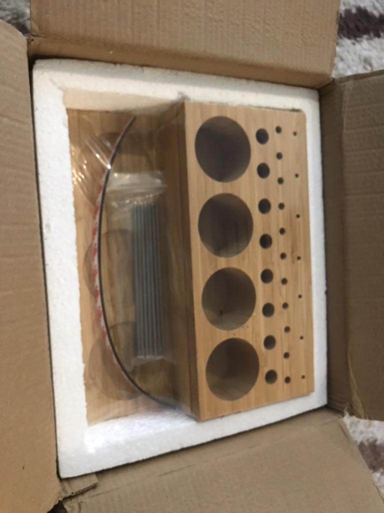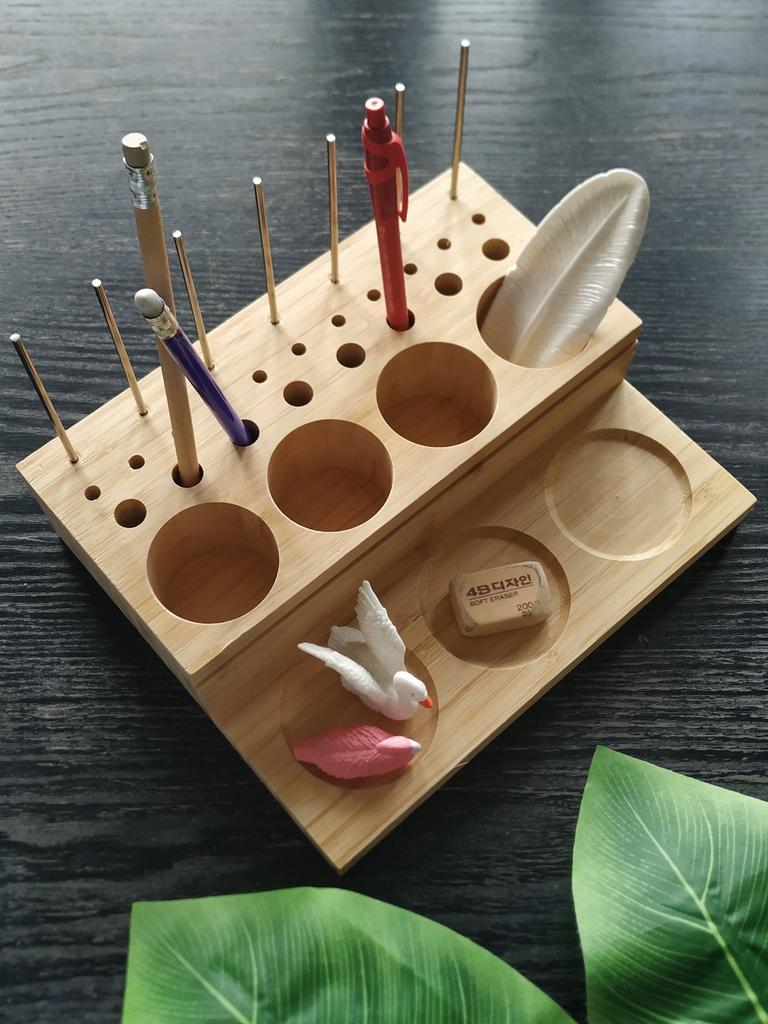 Arrived in 3 weeks at home. Super!! ⭐⭐⭐⭐⭐ It's meant to hold fishing spools, but you can also use it for pens, pencils and other writing items. It keeps the desk nice and organised. Made of Bamboo wood. Comes with a magnetic strip and metal pins. Good quality! I advice!! 😘👌🏻