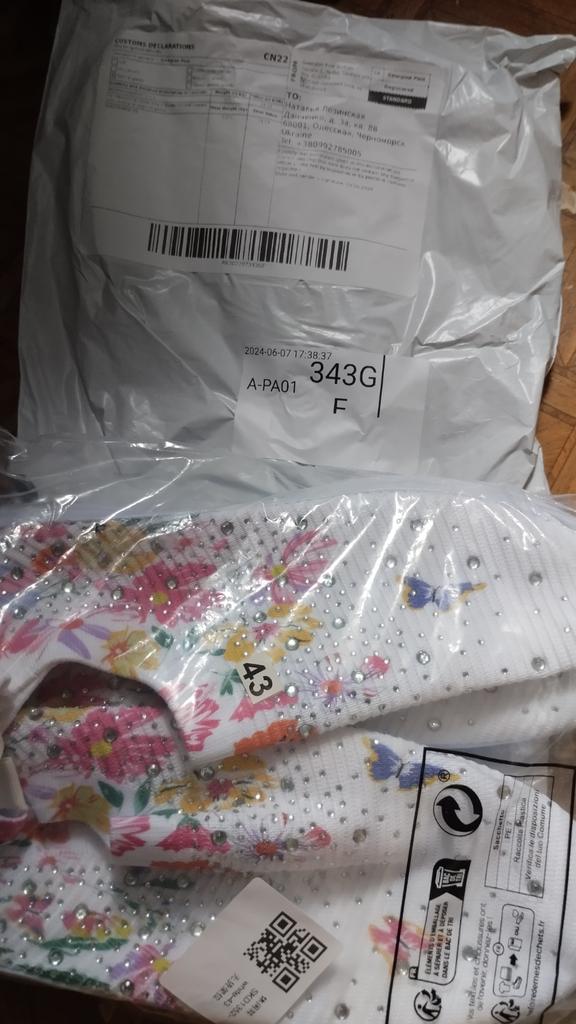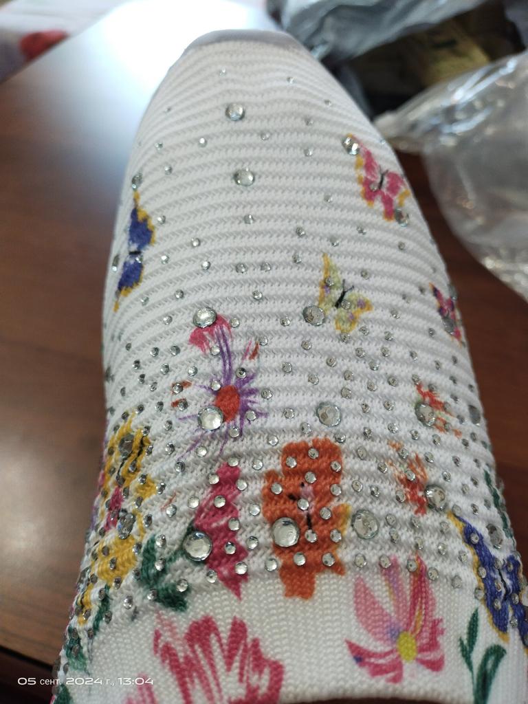 I ordered size 39 for my 38. They fit. Snow-white synthetic top with a printed pattern and glued rhinestones, does not stretch very much. There is a smell, but I think it will fade. Light. High. Just ahead of the summer season. The price was low, due to the order of several items. There is a small flaw: there is a braid sewn onto the back, it is a different color. The order from 21.03 was delivered to the post office on 12.04. For our region, this is even good.