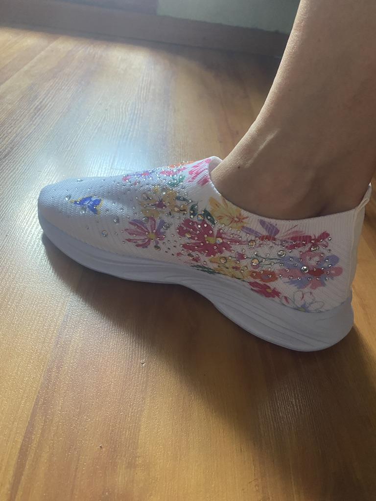 Women's Rhinestone Decor Slip On Sneakers with Floral & Butterfly Print - Breathable Knit Running Shoes
