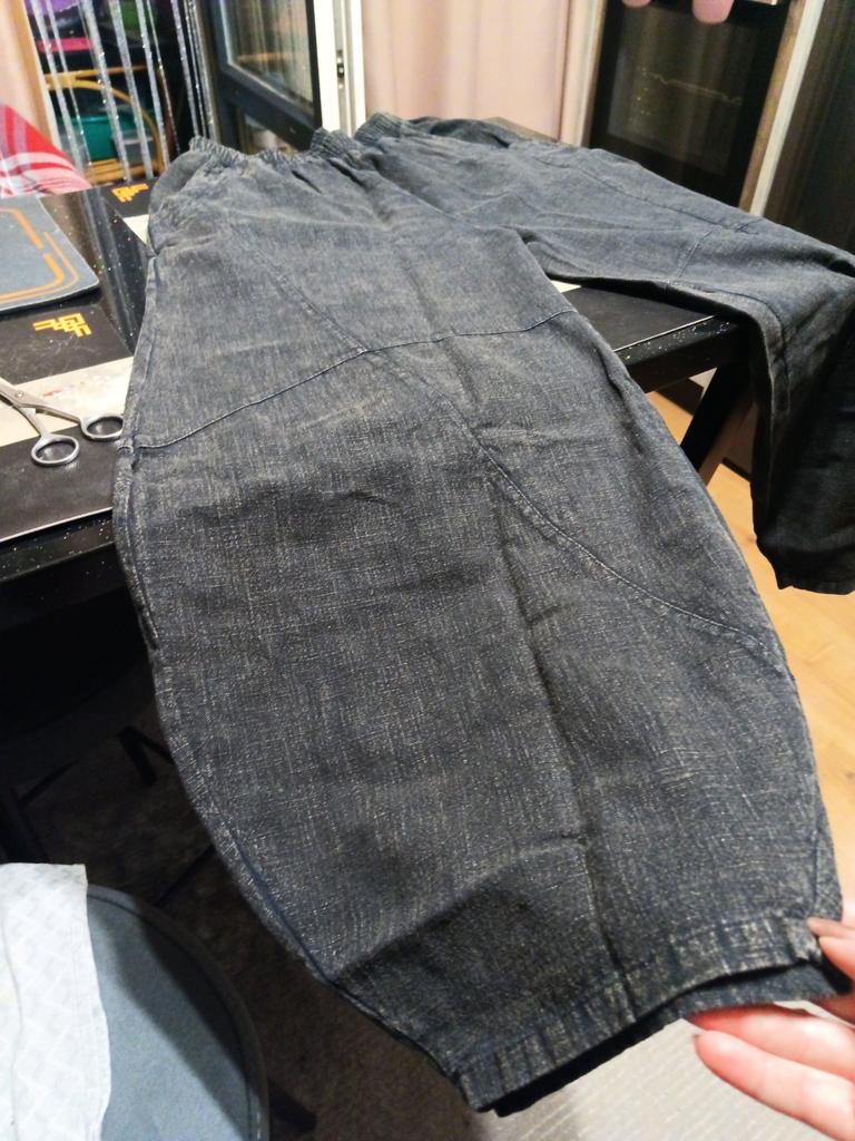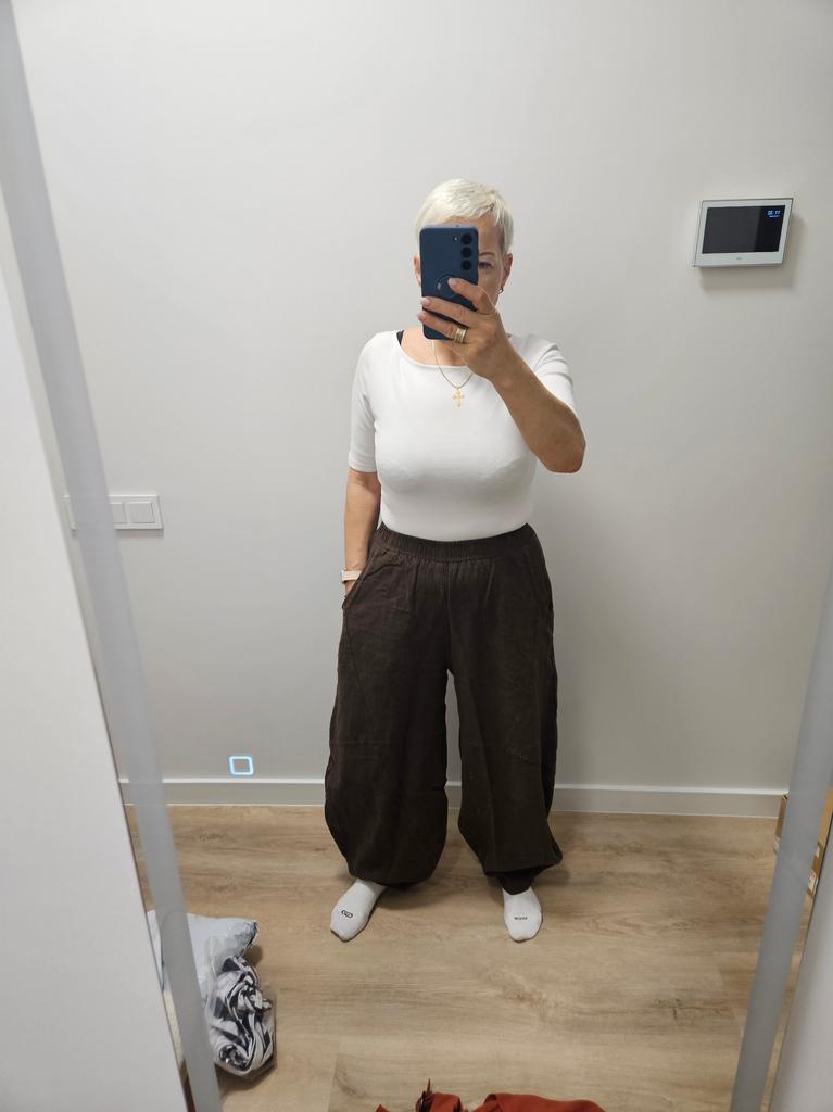The pants are wonderful. The color (purple) is noble. Something between purple and burgundy. The fabric is like thick linen. For a height of 170, OT 93 fits well. Thank you.