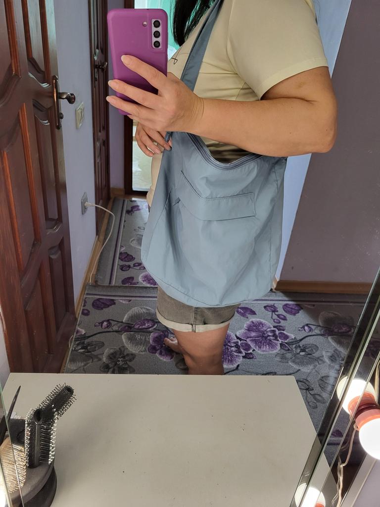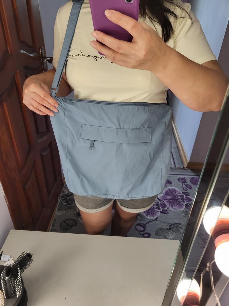 The bag is of a decent size. It will fit everything you want and even more. It's uncomfortable to carry on one shoulder, the strap is thin and made of the same material as the whole bag, slippery like the fabric from which windbreakers are sewn.