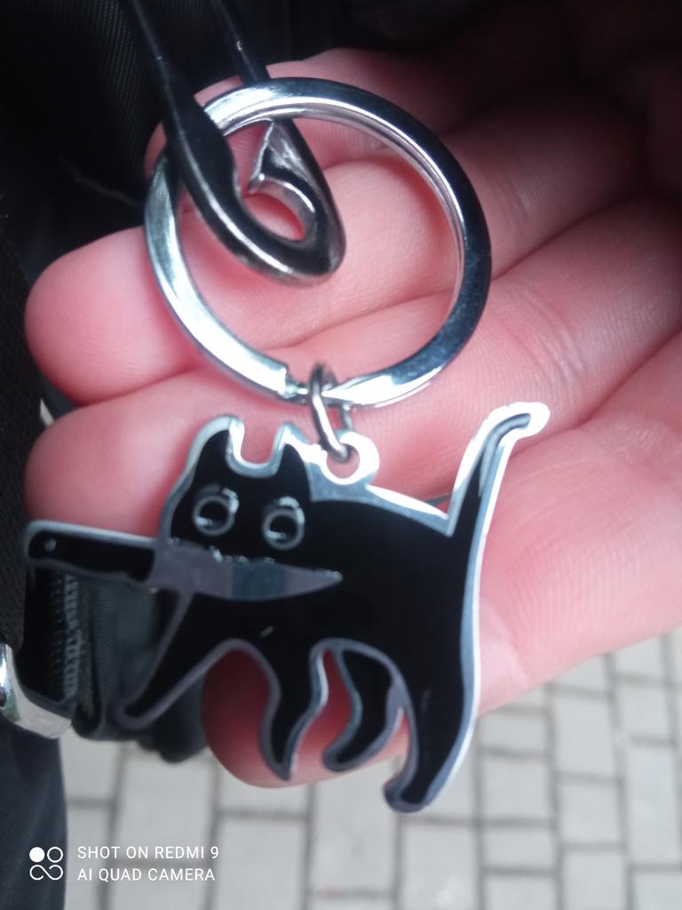 The keyring is missing a chain. The cat's tail gets caught in the ring