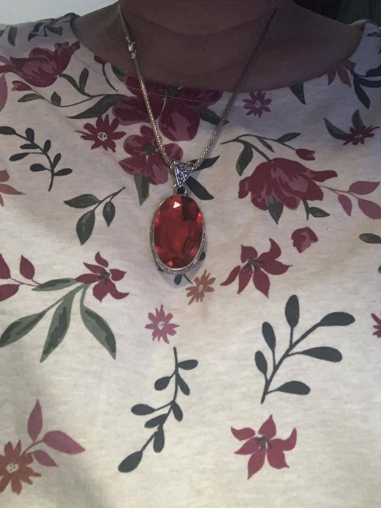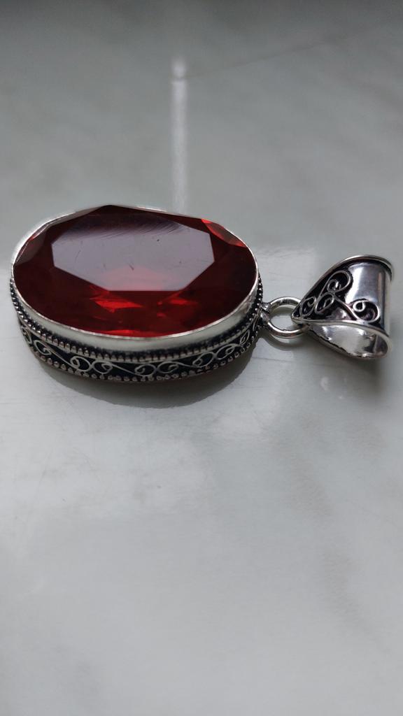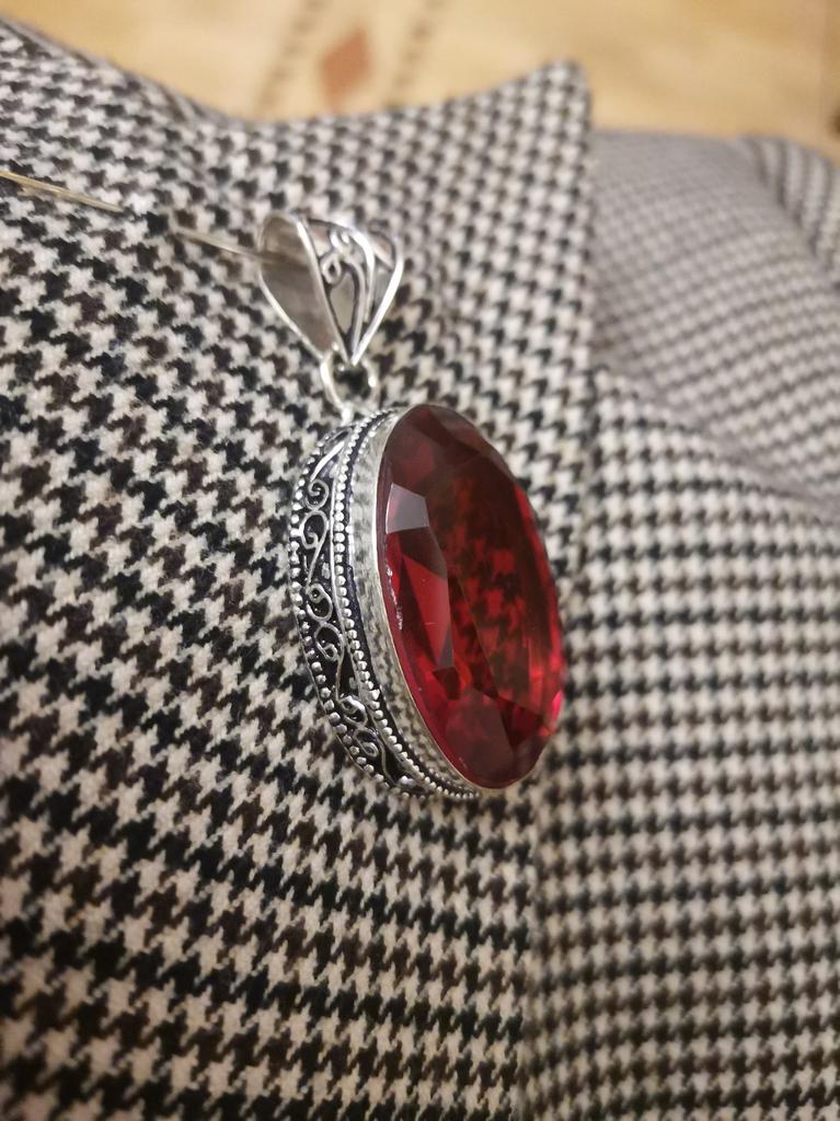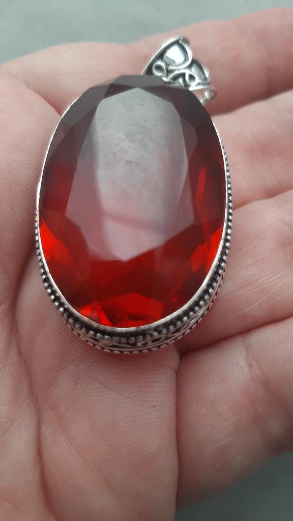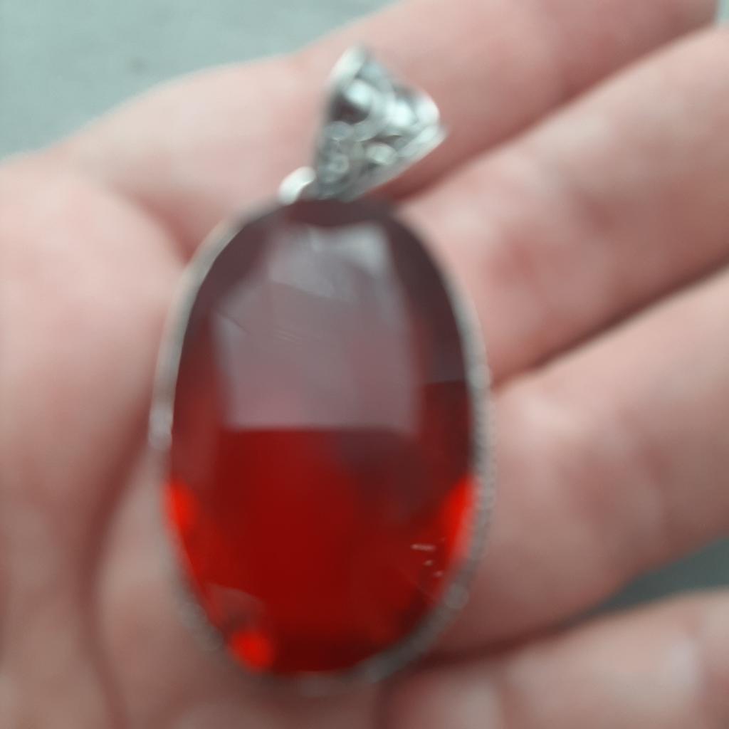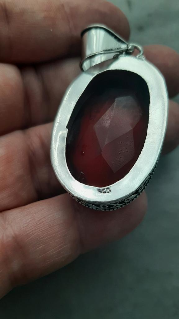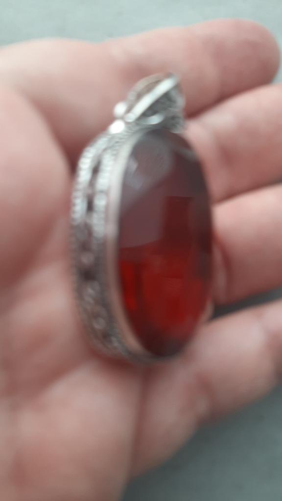 The pendant is very large But nothing confirms that this is silver and that the insert is garnet. Especially to a simple person, it seems like an unevenly cut piece of glass.