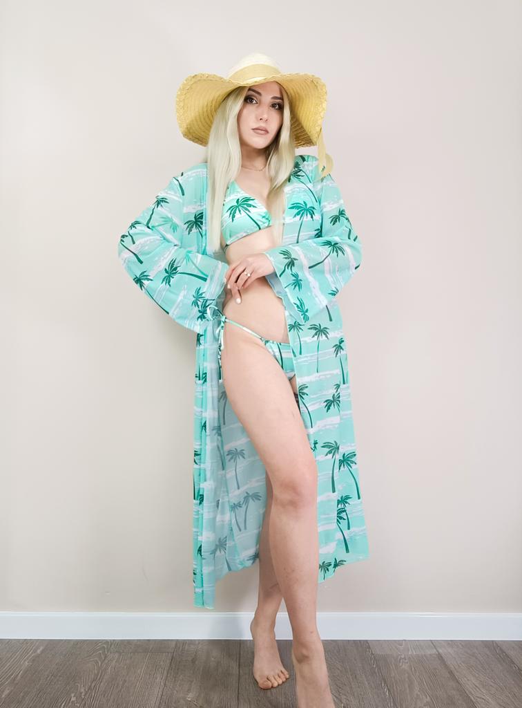 Swimsuit Women's Split Three Piece Set High Waist LongSleeve Ins Overshirt Drawstring Printed Bikini Suits