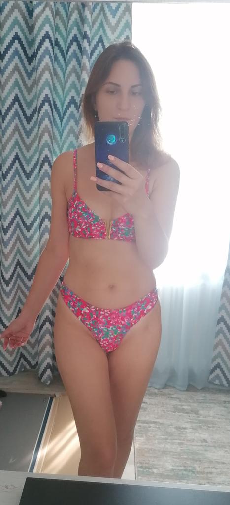 * sexy bandeau bikini with floral pattern * ๐ฅ๐๐ถ๐ฒ๐ณ๐ฒ๐ฟ๐๐ฒ๐ถ๐ Good 3 weeks ๐ฅ๐๐ถ๐ฒ๐ณ๐ฒ๐ฟ๐๐บ๐ณ๐ฎ๐ป๐ด The delivery includes 1 bikini with gold details on the neckline in the corresponding color and size. It is available in 3 different colors (green, blue and red) in sizes S to L. I ordered it in size M in red. I wear size 36 to 38. I weigh 62 kg over 172 cm. Cup size 75D. The bikini fits me like a glove. ๐ฅ๐ค๐๐ฎ๐น๐ถ๐รค๐ The bikini convinced me of its quality. ๐ It is opaque and has removable pads for a pleasantly light push-up effect. The briefs are cut slightly higher and wider (high waist). Unfortunately, the top cannot be individually adjusted tighter or looser at the back (this is a disadvantage) I particularly like the floral pattern and the golden detail between the breasts... it's a great eye-catcher. For material composition : 82% Polyester 18% Elastane ๐ฅ๐๐ฎ๐๐ถ๐ Mega beautiful bikini with removable pads that creates a beautiful cleavage. The eye-catcher is the golden detail between the breasts. You can order the bikini in its original size. It fits true to size. Many thanks for this great product to the manufacturer and to JOOM โค๏ธโค๏ธโค๏ธ ๐ฅฐ๐