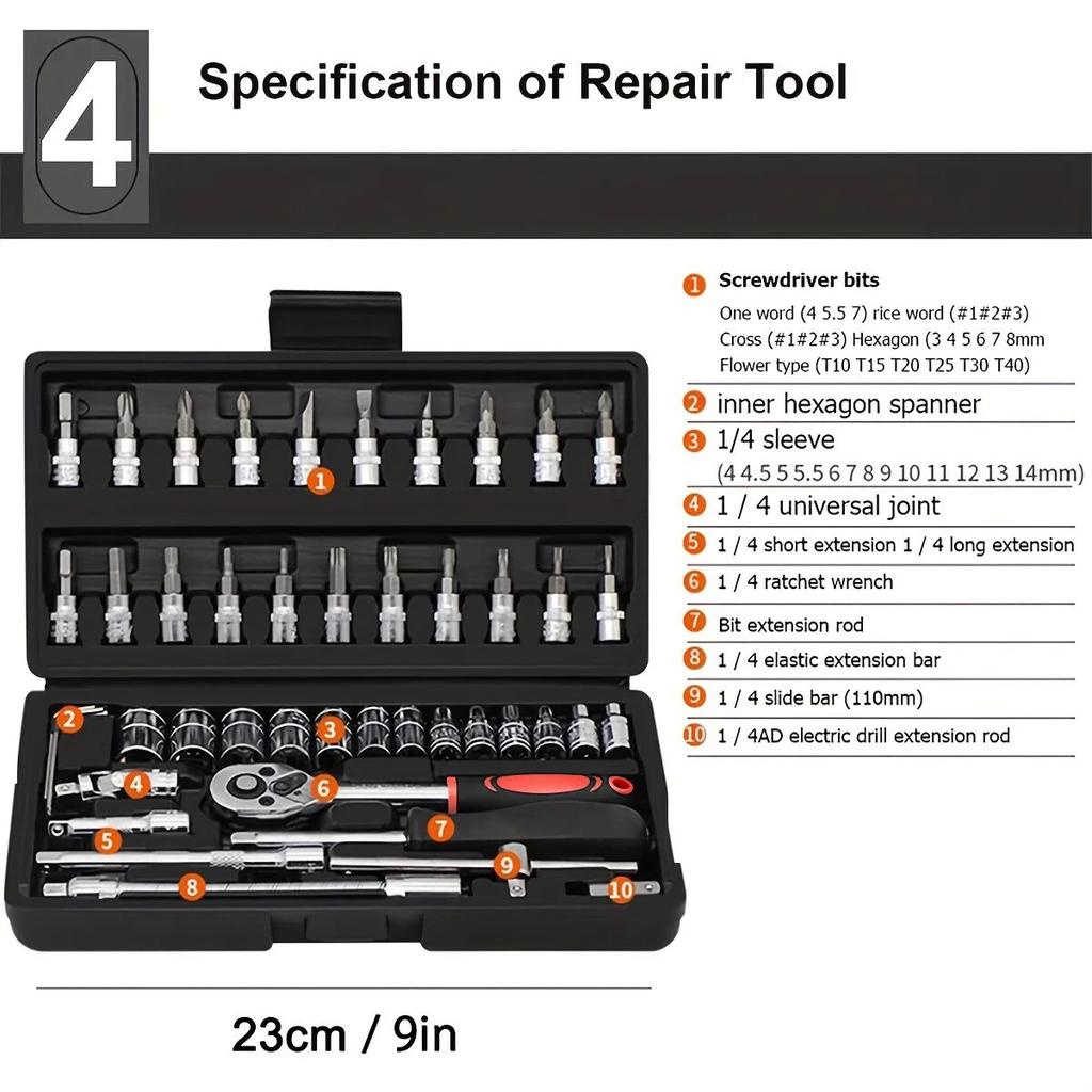 AIRAJ 46 Pieces 1/4 Inch Drive Socket Ratchet Wrench Set, With Bit Socket Set, Metric And Extension Bar For Auto Repairing