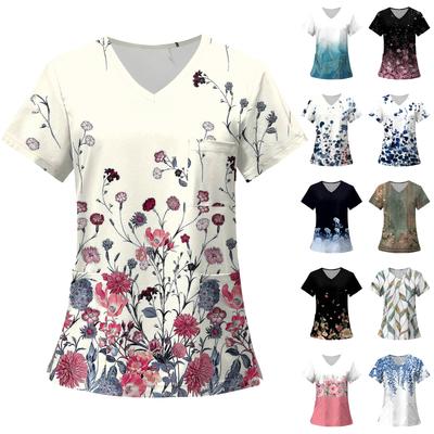 Women's Fashion Printed Work Uniform With Pocket T-Shirt Short Sleeve Top