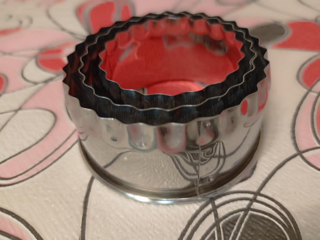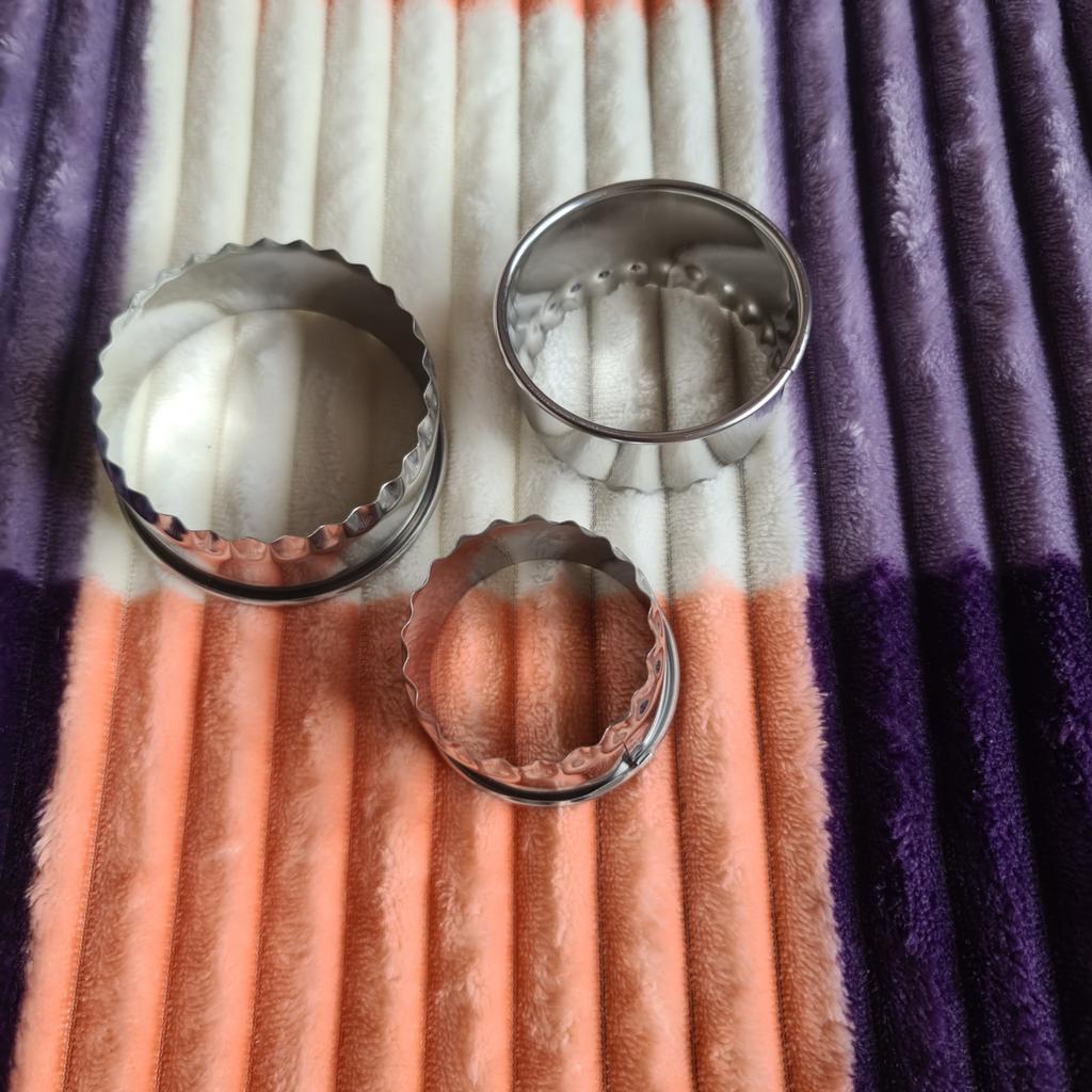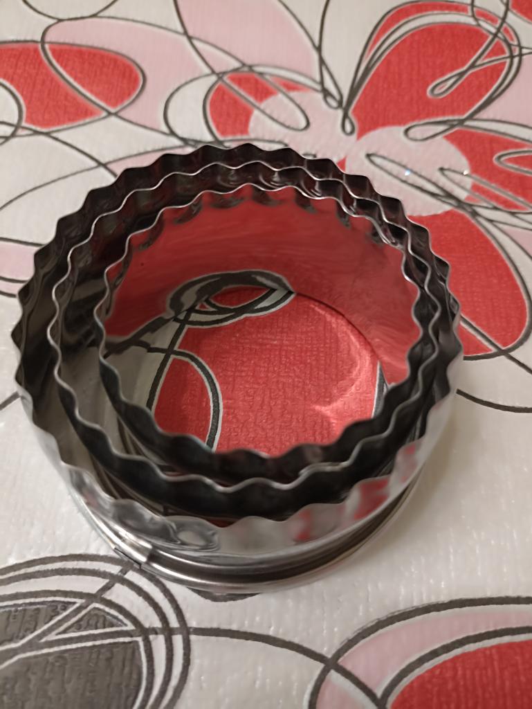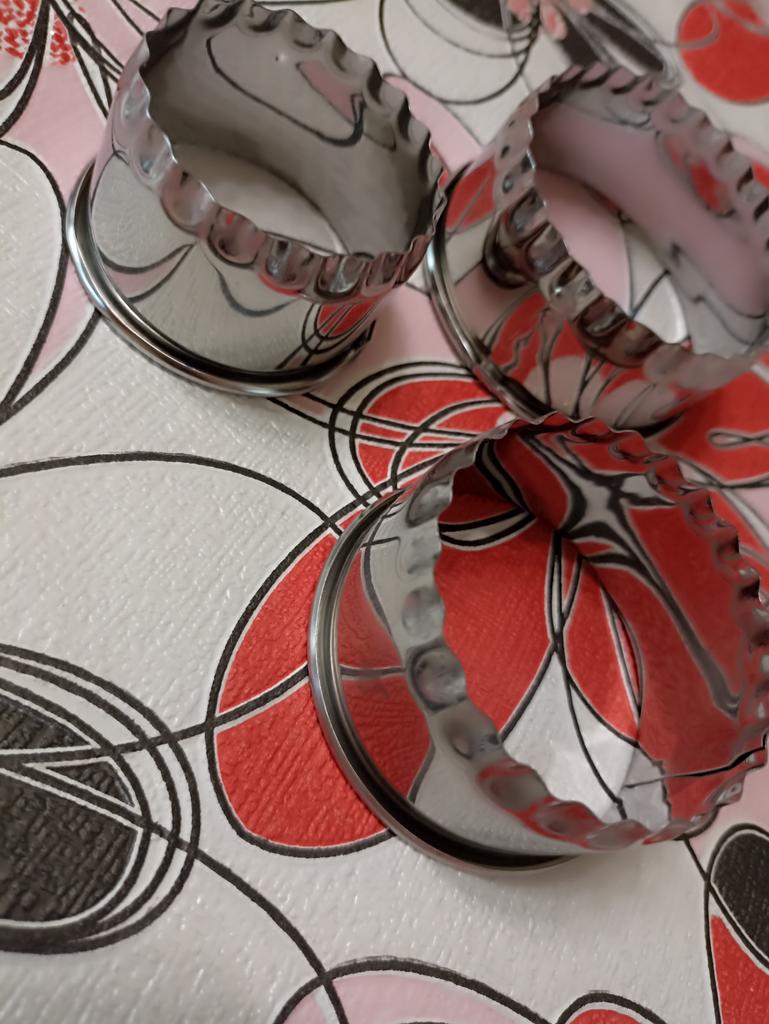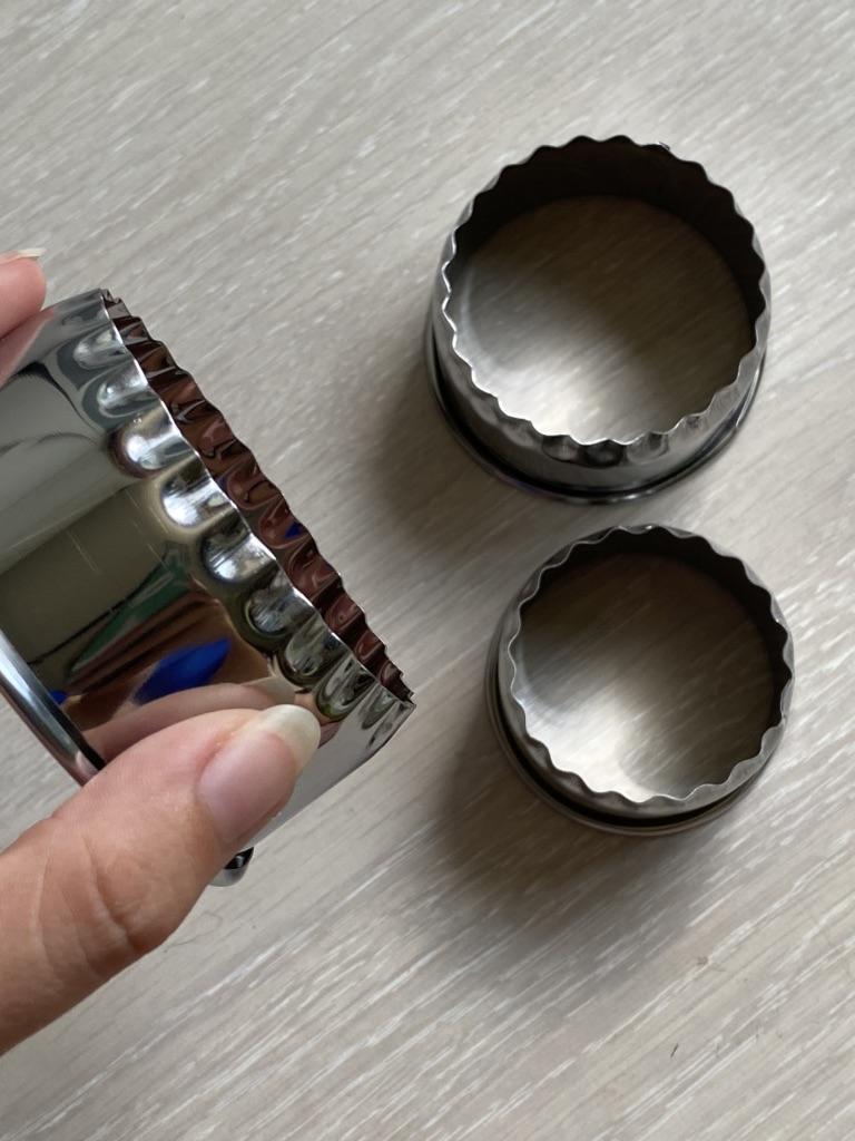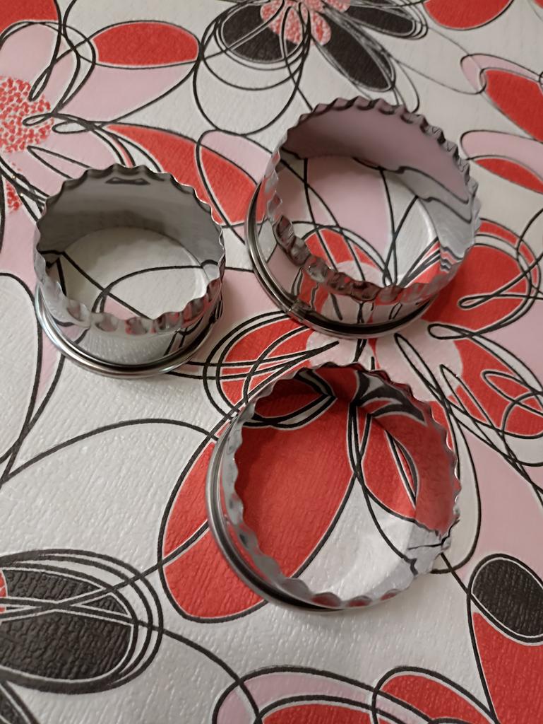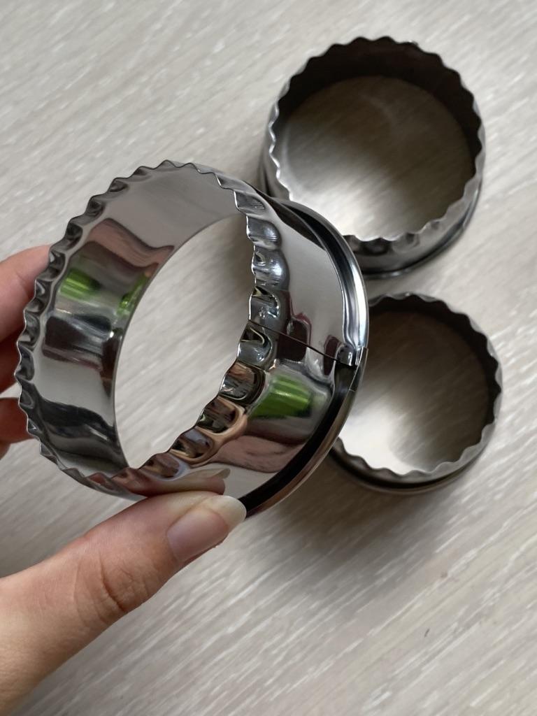 Dough cutters. Metal, stainless steel. Strong and reliable. There are two options to choose from. With a curly edge and simply round, like mine. Set includes 3 shiuks, different diameters. Suitable for making dumplings and cookies. You can make vol-au-vents (baskets) from puff pastry. Comfortable, I like it. I recommend.