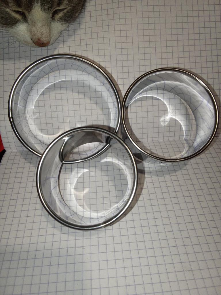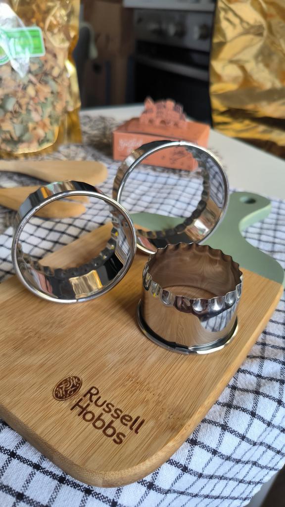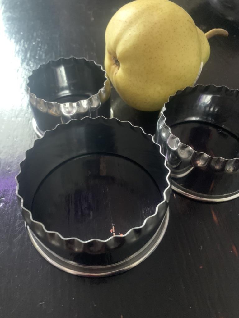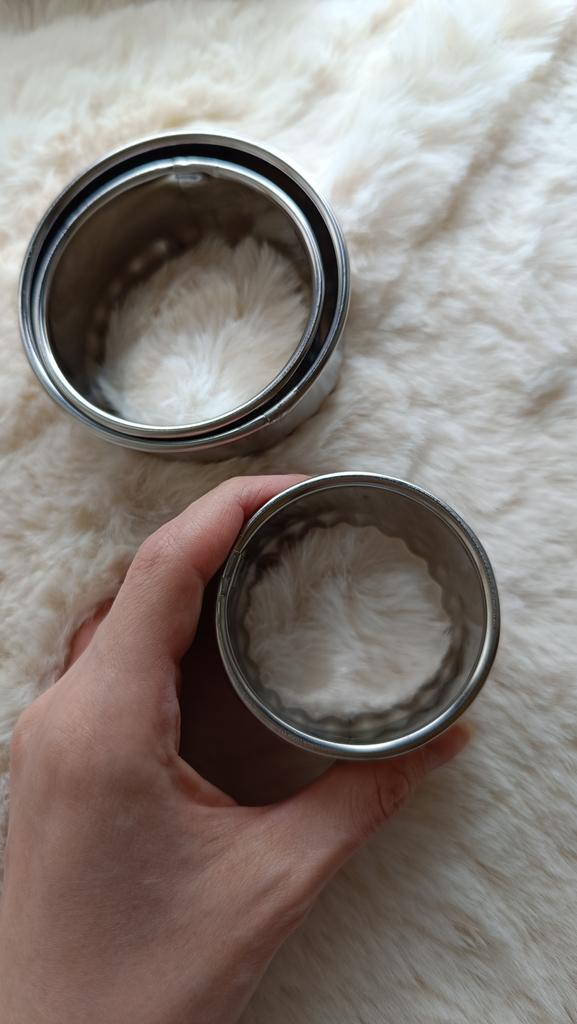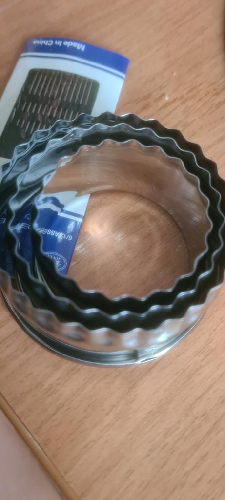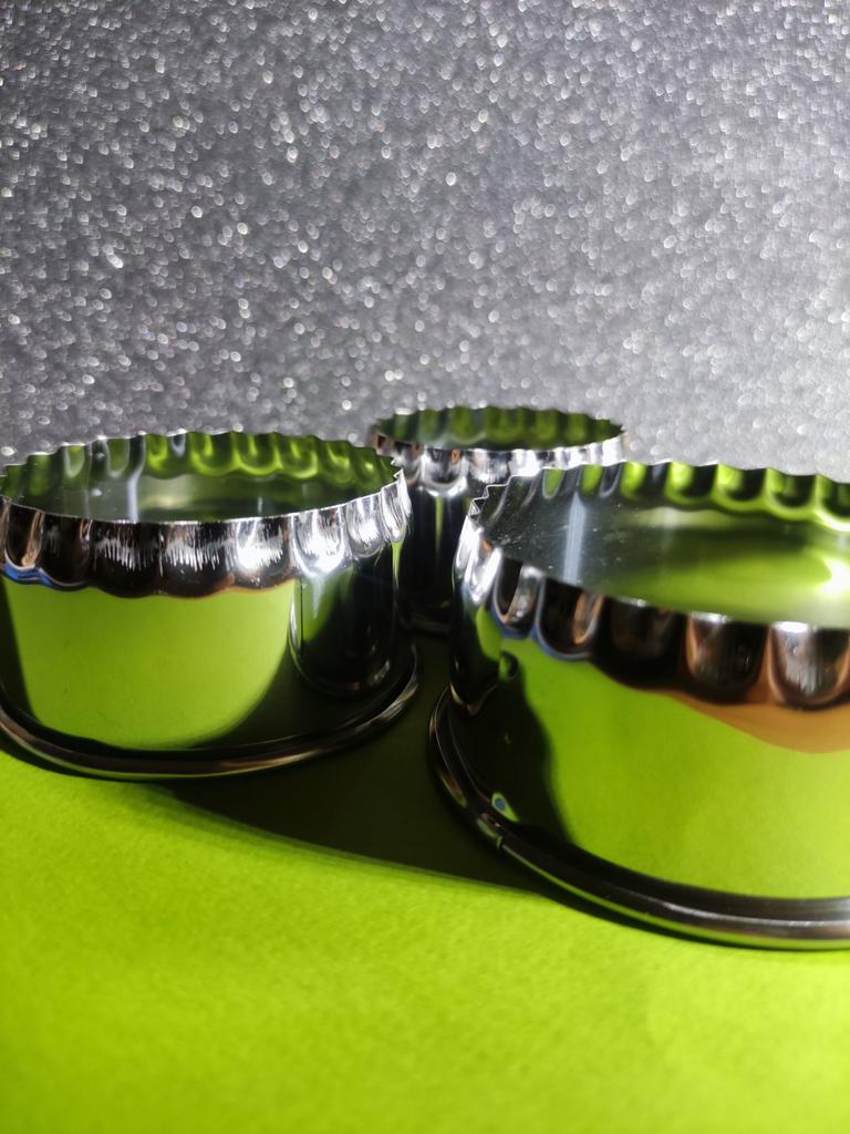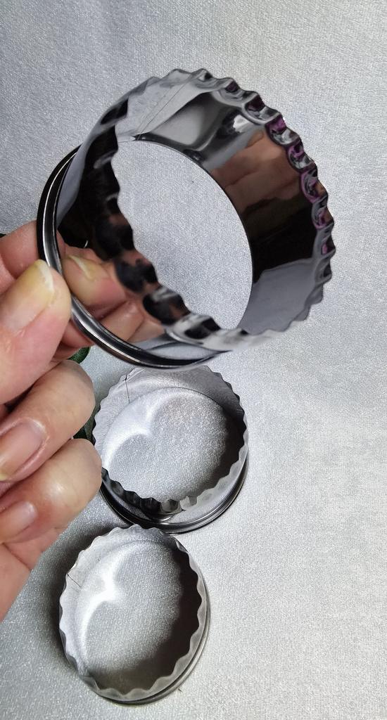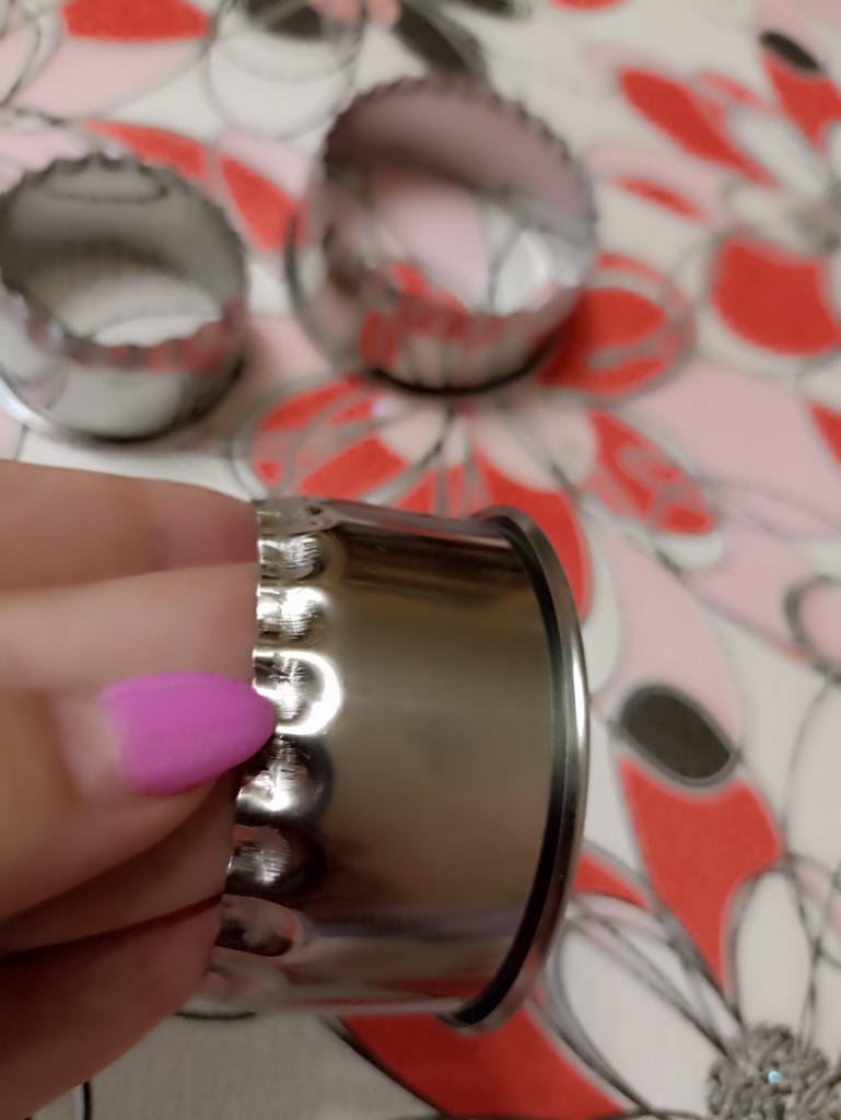 Dough cutters. Metal, stainless steel. Strong and reliable. There are two options to choose from. With a curly edge and simply round, like mine. Set includes 3 shiuks, different diameters. Suitable for making dumplings and cookies. You can make vol-au-vents (baskets) from puff pastry. Comfortable, I like it. I recommend.