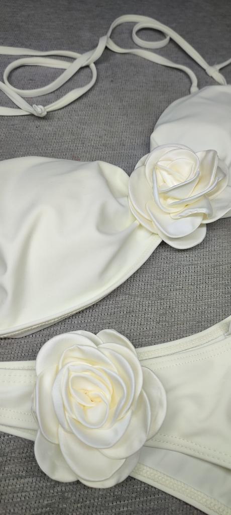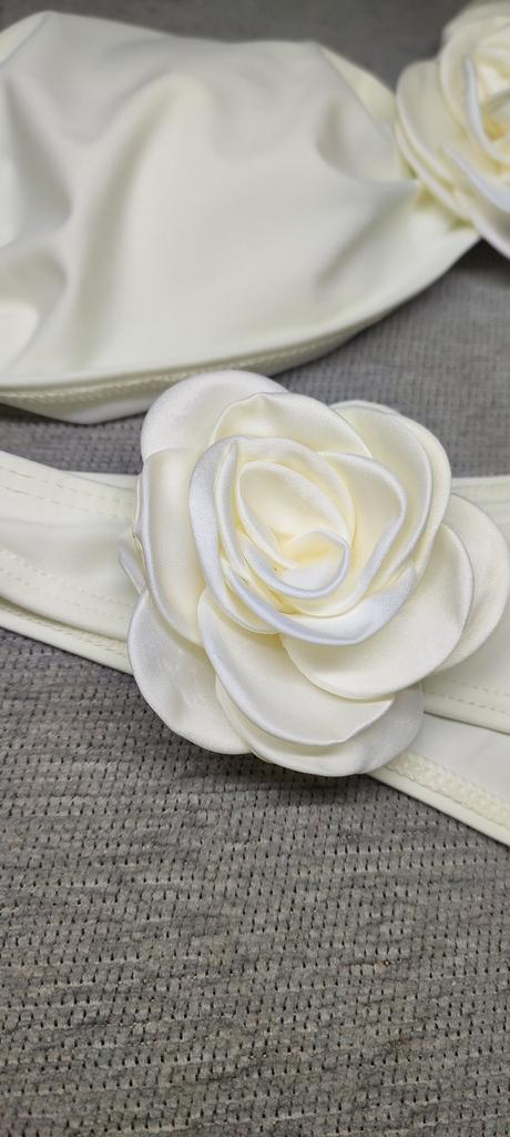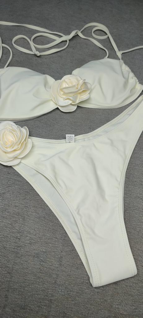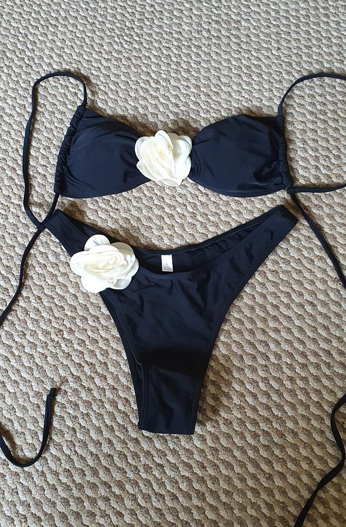 Sexy and chic bikini top with three-dimensional flowers and contrasting color stitching.
