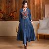 Johnature Woman Spring Pocket Cotton Single Breasted Long Sleeves Dress V-Neck Embroidery Solid Color A-Line Dress