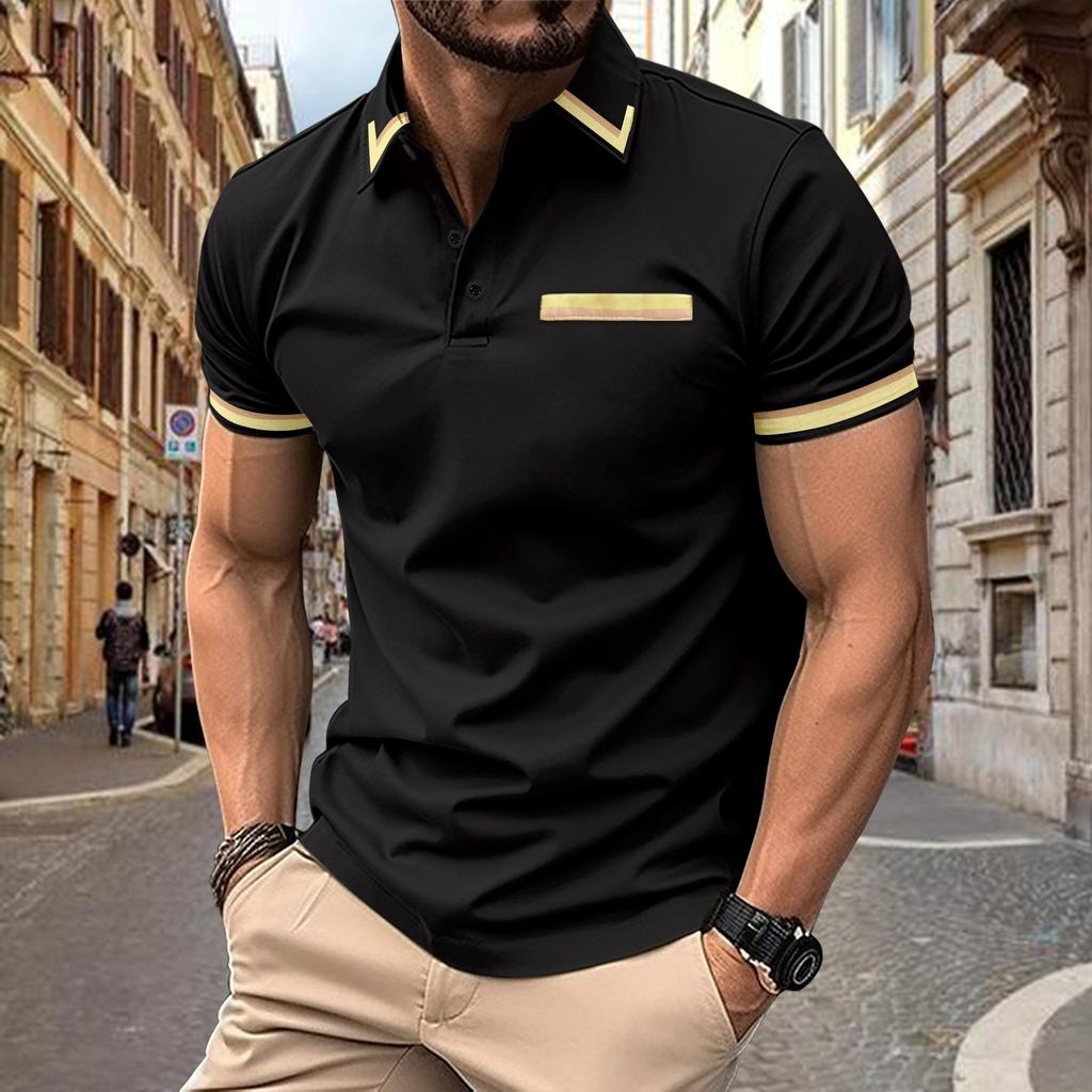 Men's Casual Polo Shirt Chest Pocket Fashion Matching Colour Lapel Peplum T-Shirt Black Top
