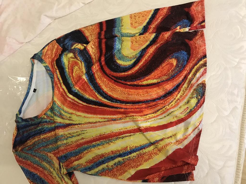The fabric is pleasant, but the impression is completely different from the picture. According to the picture, it should be worn to art exhibitions - but in life, only to fireworks shows. :))) Insanely bright, good in its own way, but not at all like in the photo. I didn't like the large round neckline that goes down - in the photo it seemed like a crew neck, that would have been better, especially for a large size like mine (4XL fit well for my 54-56). In general, you can wear it sometimes, but not as often as expected. :)))