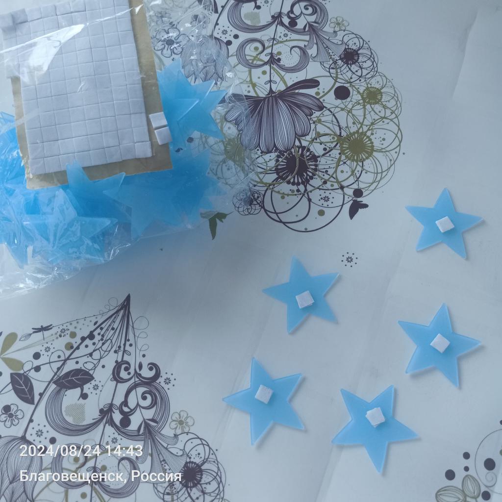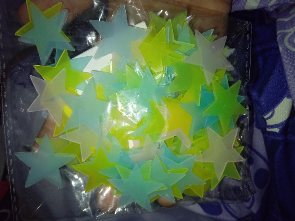 I stuck them on, they look good. There are 100 pieces in a package. It's a pity that they don't glow at night. But for a child's room they are just beautiful..!!