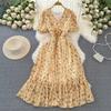 Fashion Dress for Women V Neck A-line Flounced Edge Printing Chiffon Vestidos Lace-up Folds Lining Dresses Summer