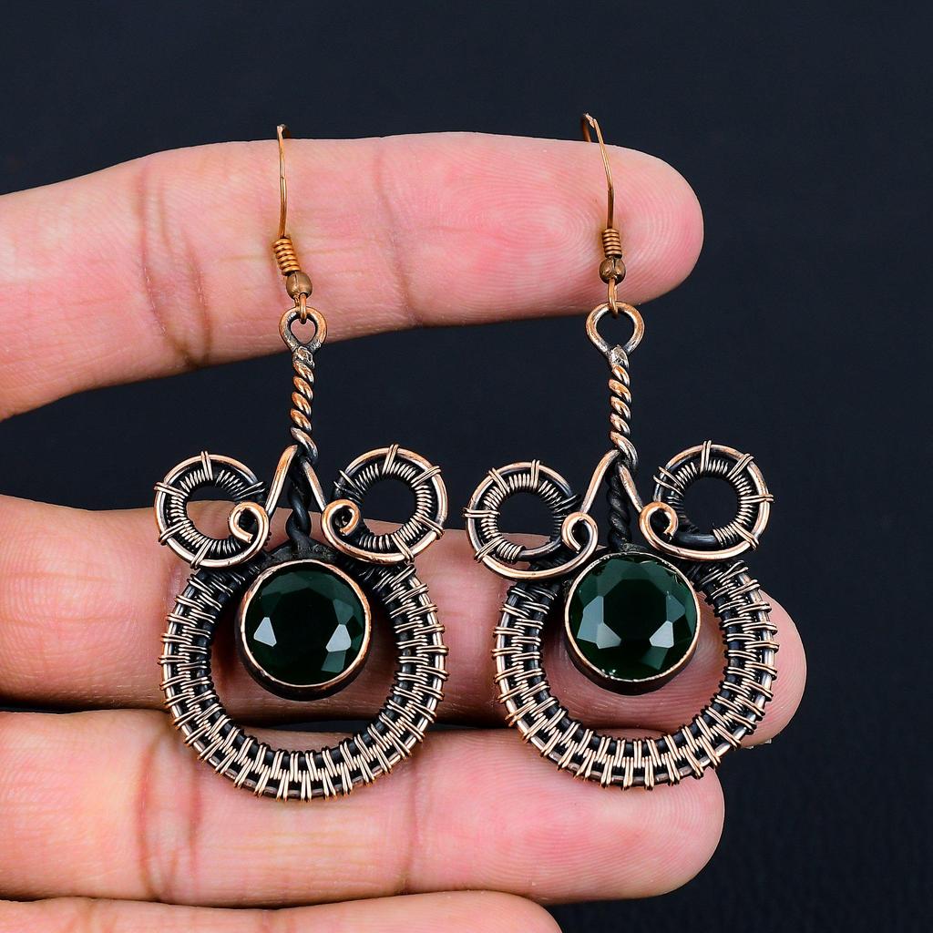 Lab-Created Emerald Gemstone Handmade Pure Copper Wire Wrapped Earrings Jewelry