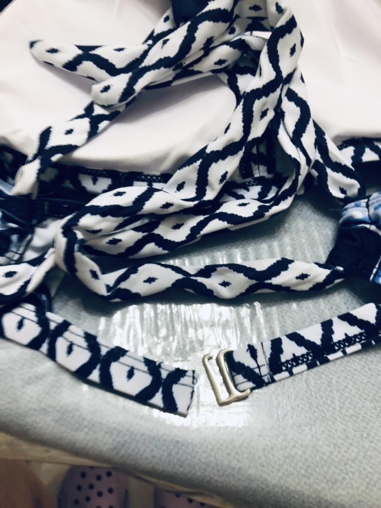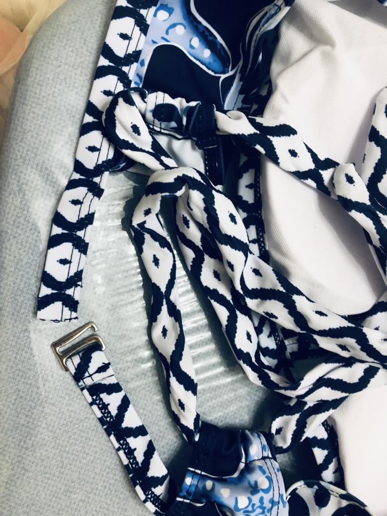 The swimsuit is simply unsuccessful, the inserts in the cups of the bra are very unsuccessful (they just flatten the chest), the upper part of the swimming trunks ("belt") is sewn with gathers, that is, it is cut wider than the main part of the swimming trunks ((. The bottom of the fabric, which is located on top of the swimming trunks, on the contrary, is gathered by overlock processing.