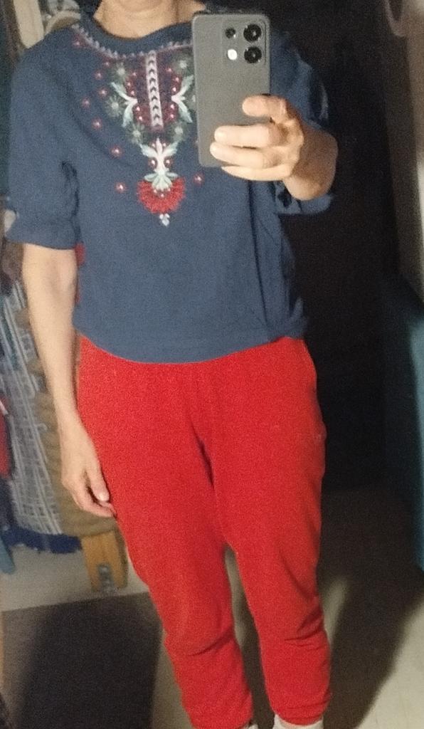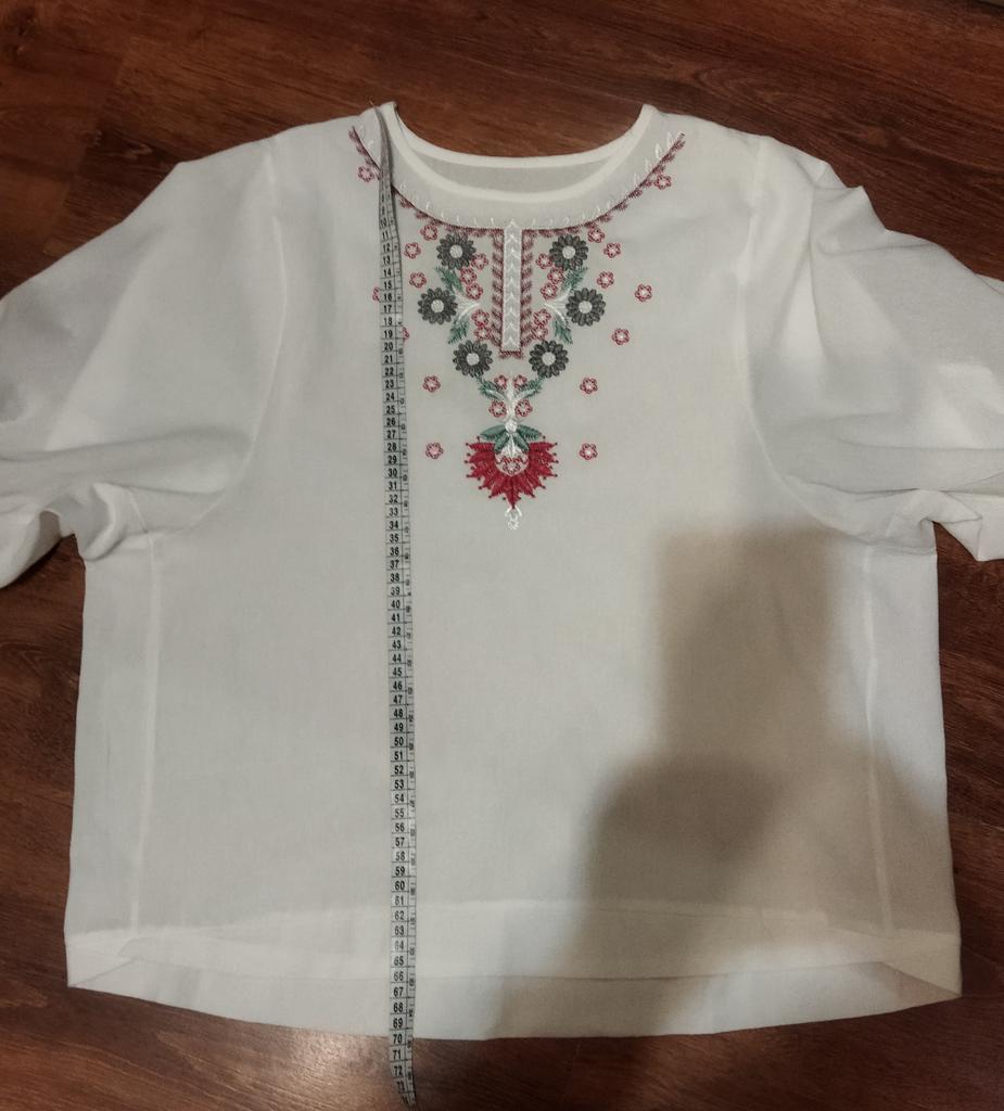 The embroidery fitted well from the top, but it was very tight on the tummy (about 90 cm), another drawback - on one sleeve the embroidery was not in the center, but went backwards, and it is a bit difficult to redo, the sleeve needs to be recut, well, I will wear it like this, the embroidery is more green, not blue as I thought from the photo. Anyway - thank you all!