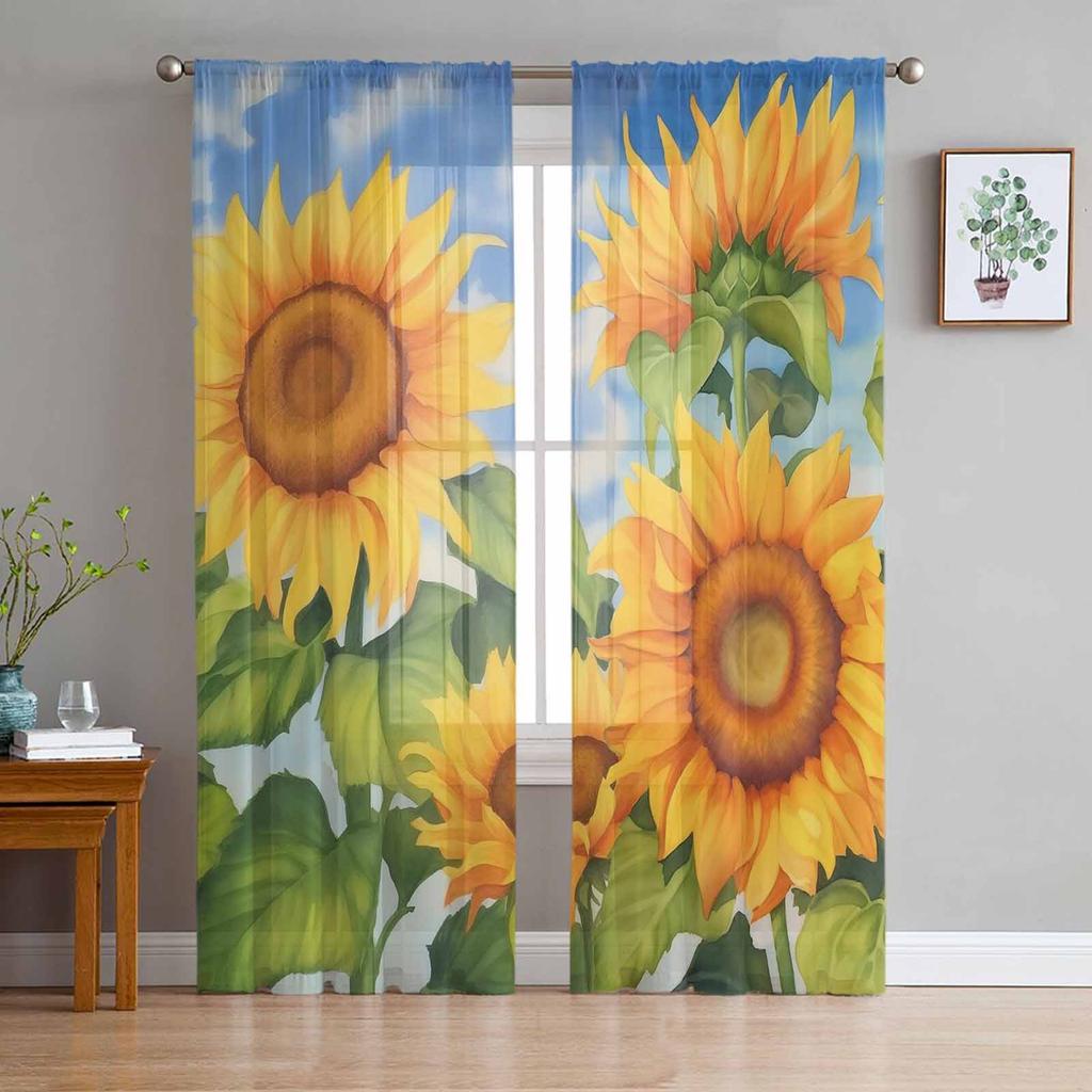 Flower Illustration Sunflowers Summer Retro Tulle Window Curtains for Bedroom Luxury Home Drapes In Living Room Chiffon Panels