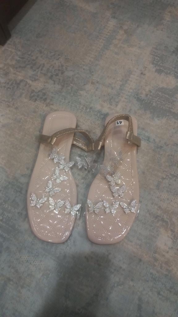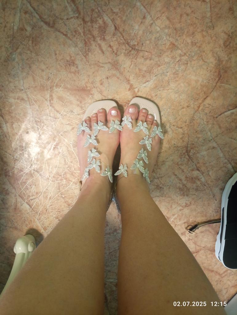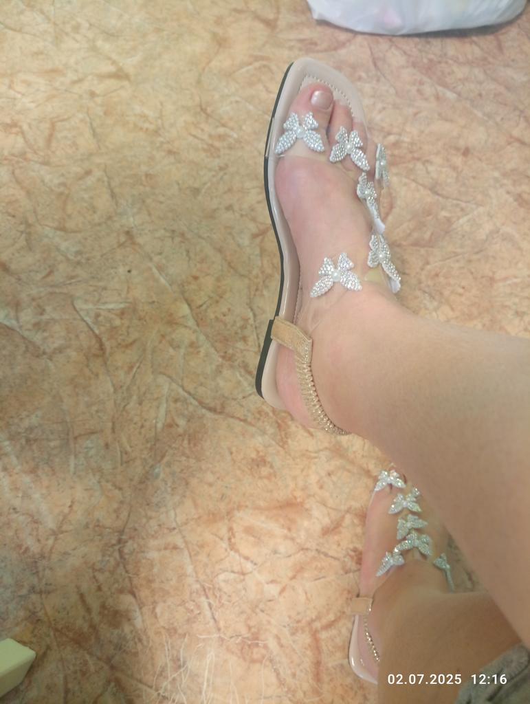 Like in the photo with one exception: the elastic at the back is not beige, as in the photo, but for some reason golden. But they are still comfortable. For a foot length of 26.3 cm, I took size 43 according to the size chart - they fit perfectly, the toes don't overhang, there is even a small margin. Very comfortable, they don't rub anywhere, don't press on the bone, the foot looks more elegant in them. Very happy with the purchase!