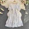 Fashion Summer Flower Print Long Dress Women Vintage Square Neck Ruched Chest Split Sundress Party