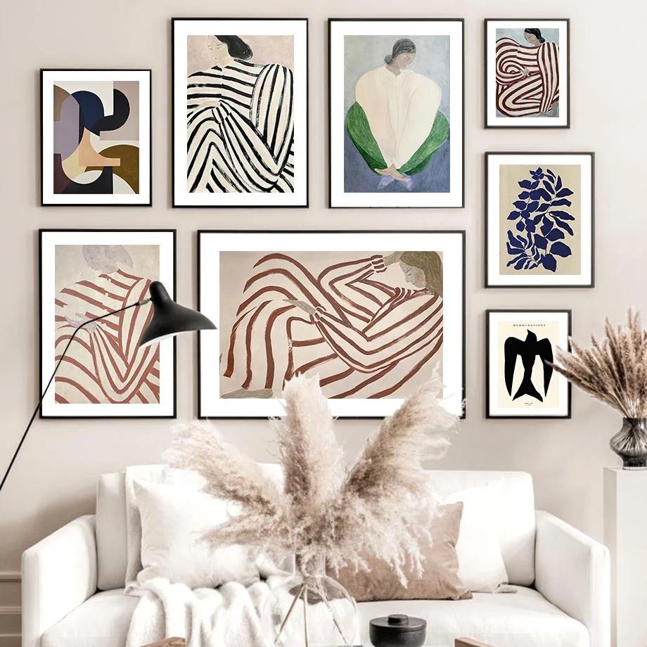 Sofia Lind Striped Pajamas Woman Geometry Leaf Canvas PaintingNordic Poster Wall Art Print Retro Pictures For Living Room Decor