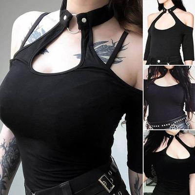 Women Girls Fashion Gothic T Shirt Off-the-shoulder Halter Neck Punk Tees Top T Shirts Party Clubwear Slim Lady Backless