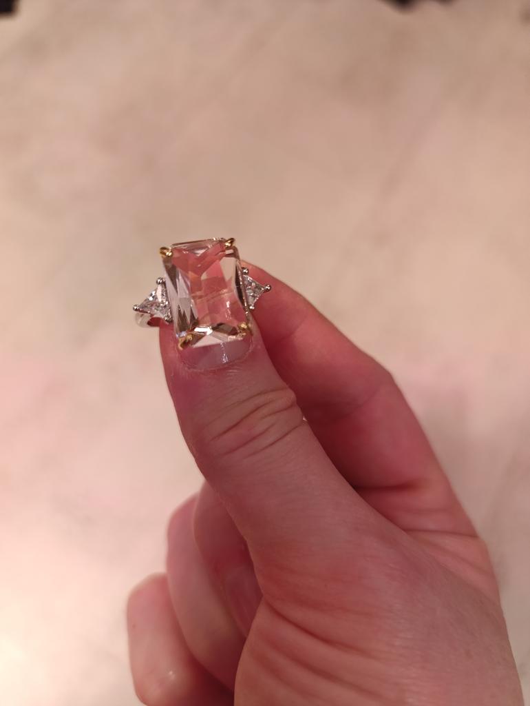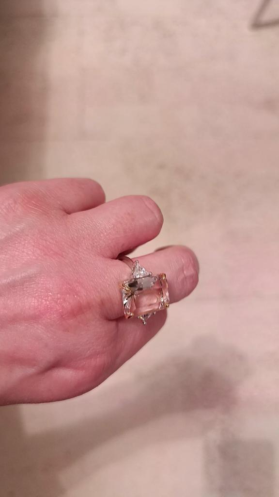 The ring is large, spectacular, looks like white gold with yellow gold on the paws around the stone. The stone is beautiful pink.