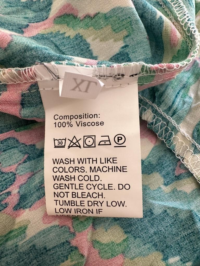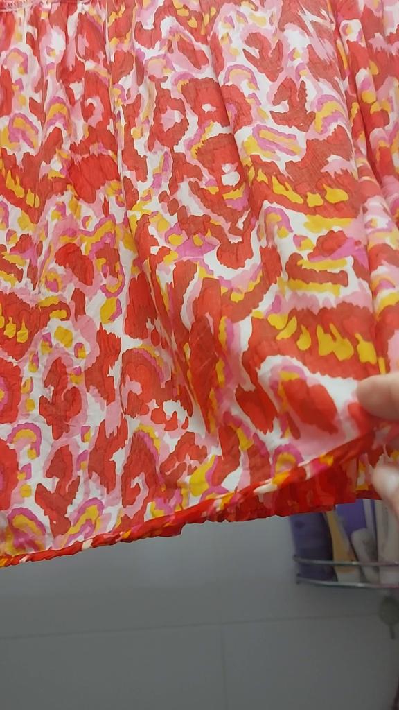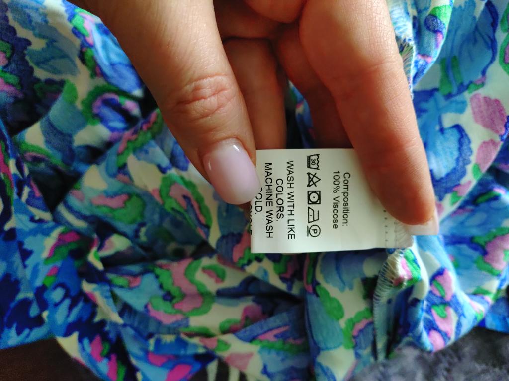 The fabric is nice, viscose, it wrinkles a lot, the style is probably boho, a bit wide.