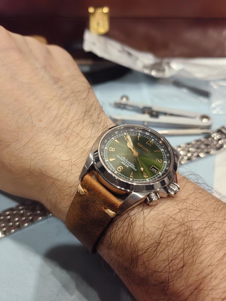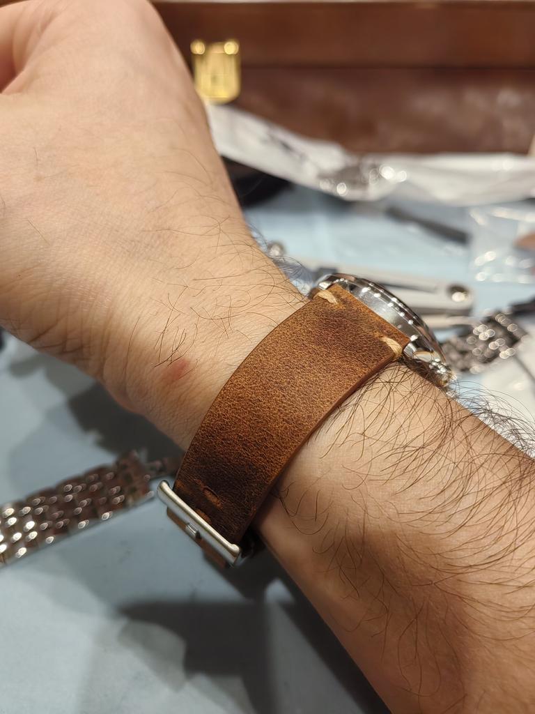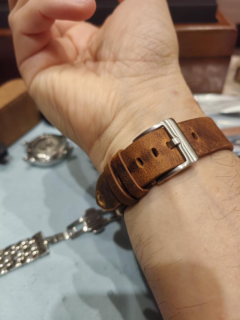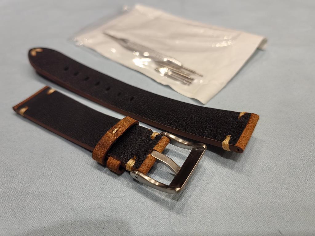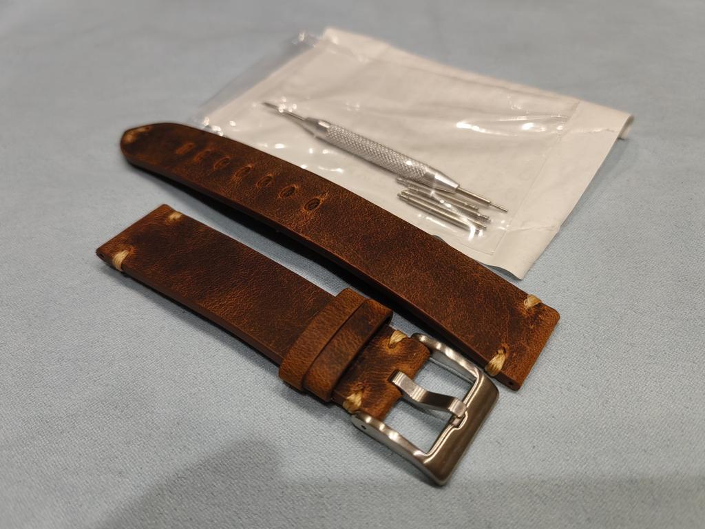 Good strap, quite springy but took shape quickly. The leather is of such a finish that it scratches easily. But it looks good, like aged. The set includes a spring bar remover and several thick spring bars.