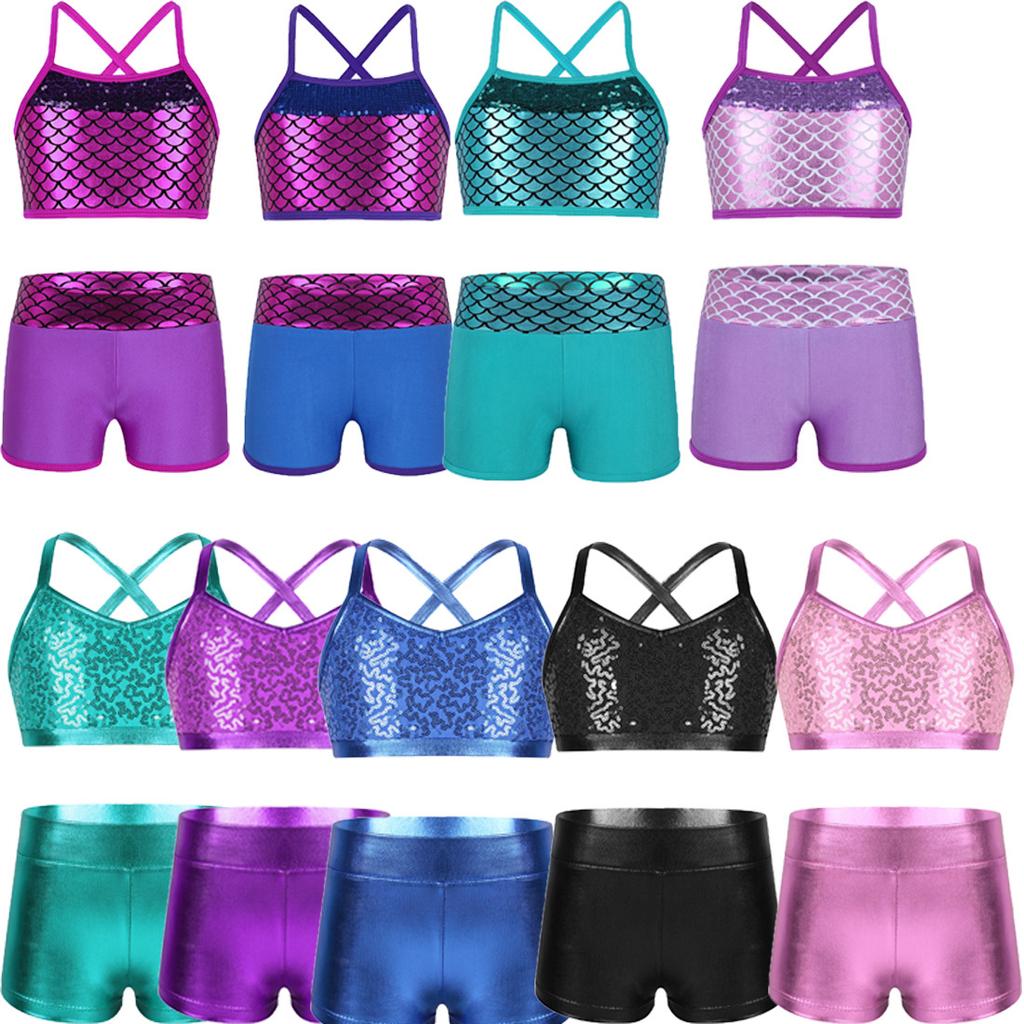 Girls Two-Piece Dancewear Outfit Shiny Sequins Crop Top with Bottoms Set for Stage Performance Dancing
