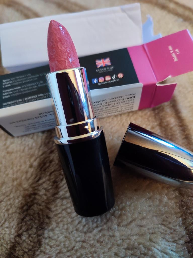 * Lipstick with swimmer effect * 💥𝗟𝗶𝗲𝗳𝗲𝗿𝘇𝗲𝗶𝘁 Exactly two weeks 💥𝗟𝗶𝗲𝗳𝗲𝗿𝘂𝗺𝗳𝗮𝗻𝗴 The delivery includes 1 lipstick in the corresponding color. It is available in 5 different colors. The lipstick contains 4 g. I ordered it in color number 11 (Hip and Hippie). 💥𝗤𝘂𝗮𝗹𝗶𝘁ä𝘁 The lipstick is very creamy in its texture and is easy to apply to the lips, especially since it is cut at an angle... this makes it easier to apply precisely. I particularly like the fact that it has a beautiful paisley flower embossing on the side. I also think the packaging is really beautiful, it changes from black to silver (see video). My chosen color (number 11) is perfect for blondes! It is light pink with a beautiful pearl shimmer. I also think it's great that it moisturizes the lips wonderfully. The only disadvantage is that it's not kiss-proof and you have to keep reapplying it after eating.. The lipstick is absolutely odorless and tasteless. 💥𝗙𝗮𝘇𝗶𝘁 Super beautiful lipstick, which comes in exactly the same color as shown in the manufacturer's pictures. The only downside is that it is not kiss-proof. But it doesn't bother me any further.