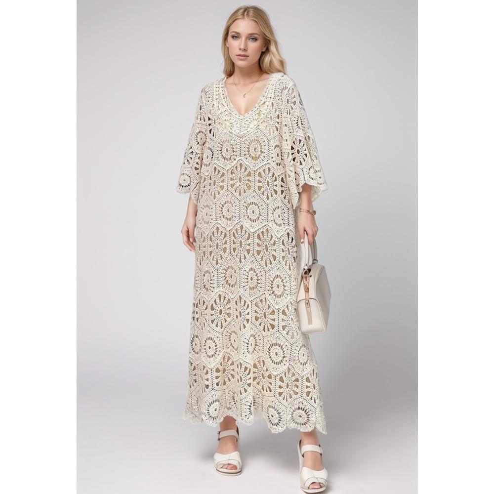 DIMANAF 2024 New Summer Women Long Knitted Dress Sleeve Basic Fashion Lace Dresses Casual Loose White