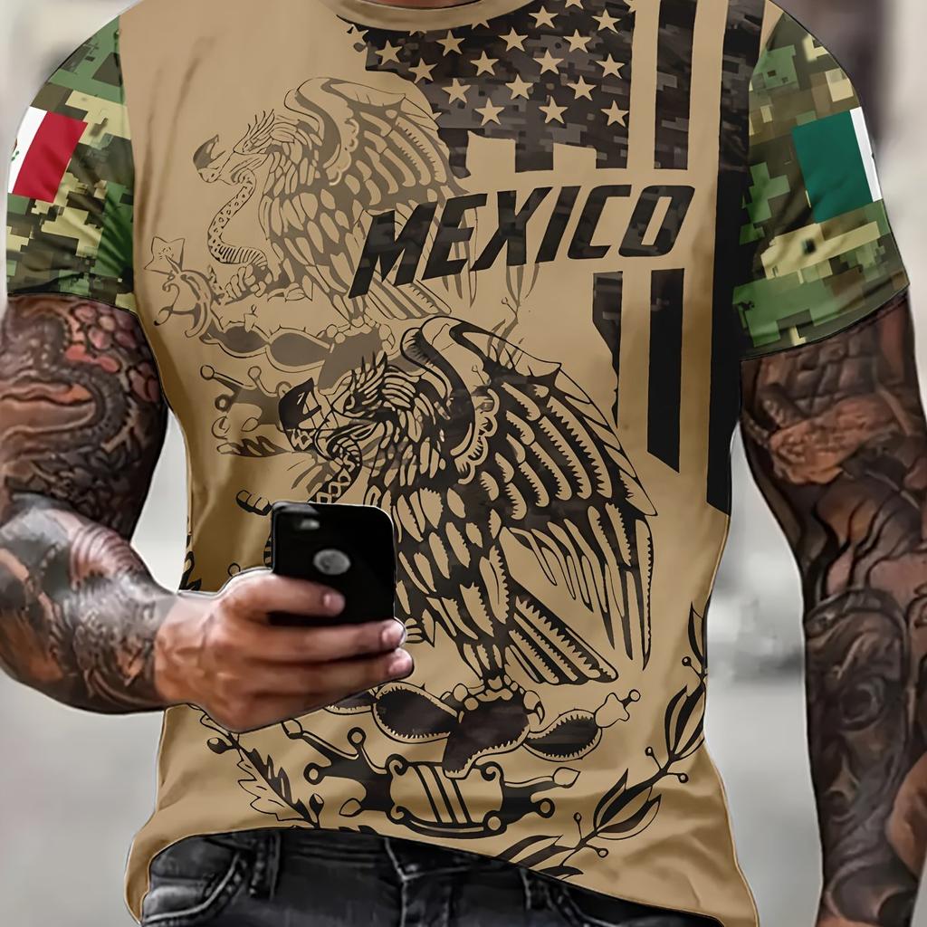 MEXICO Eagle Snake 3D Print Men's Fashion Comfy Breathable T-Shirt, New Casual Round Neck Short Sleeve Tee For Spring Summer Men's Clothing