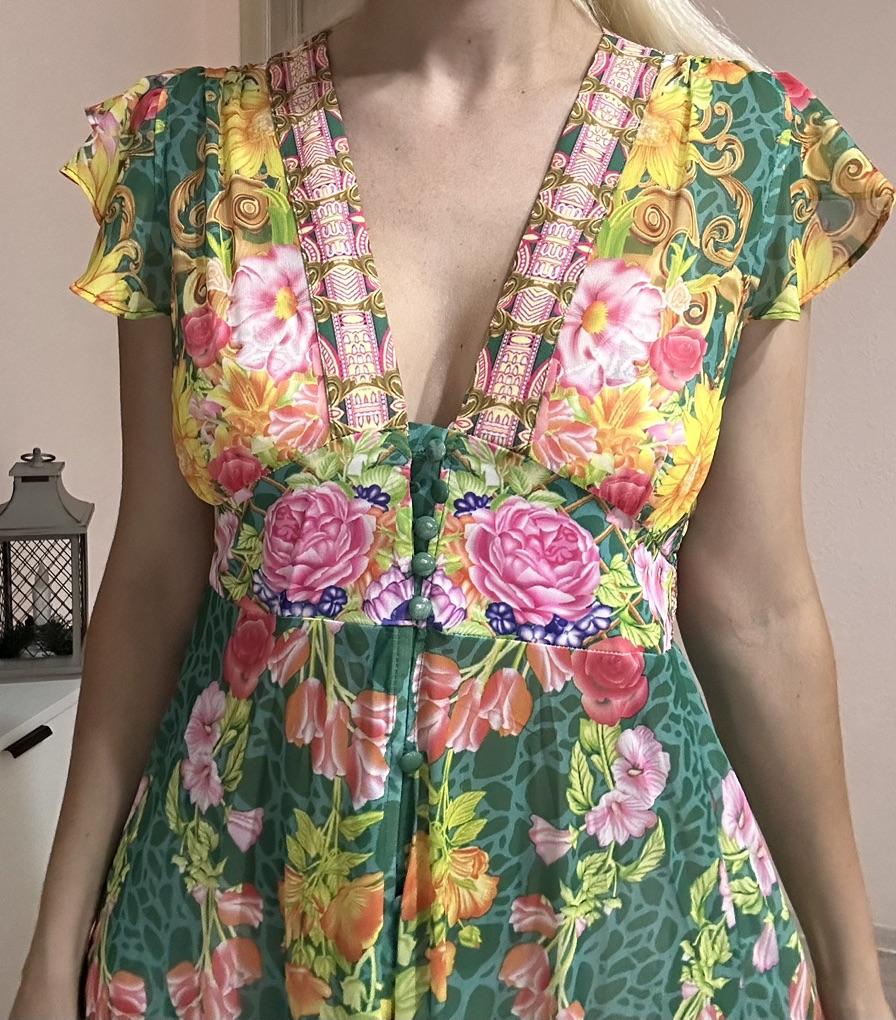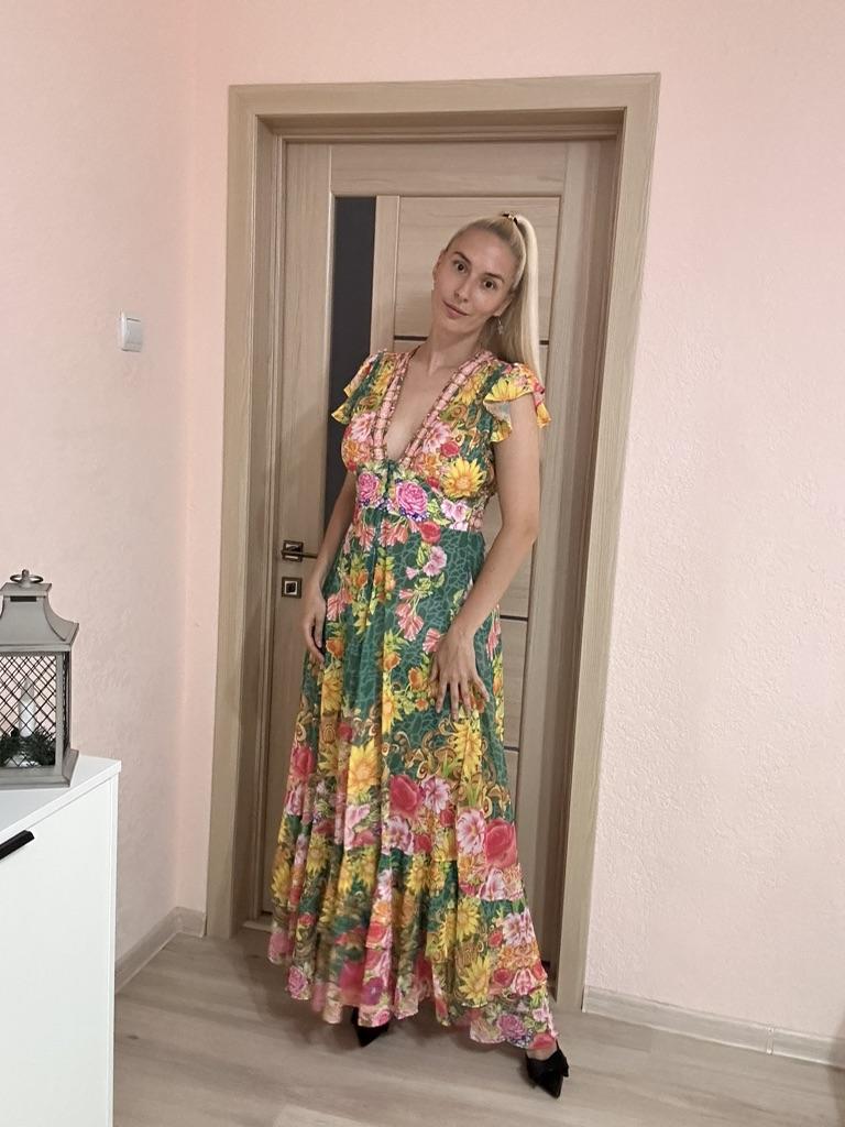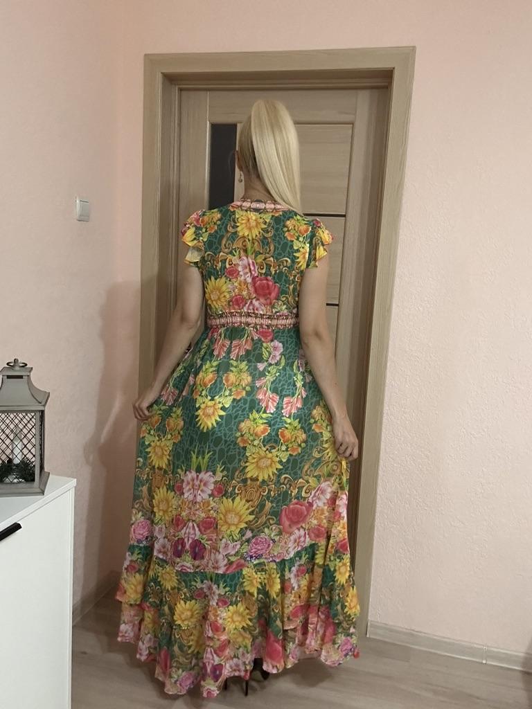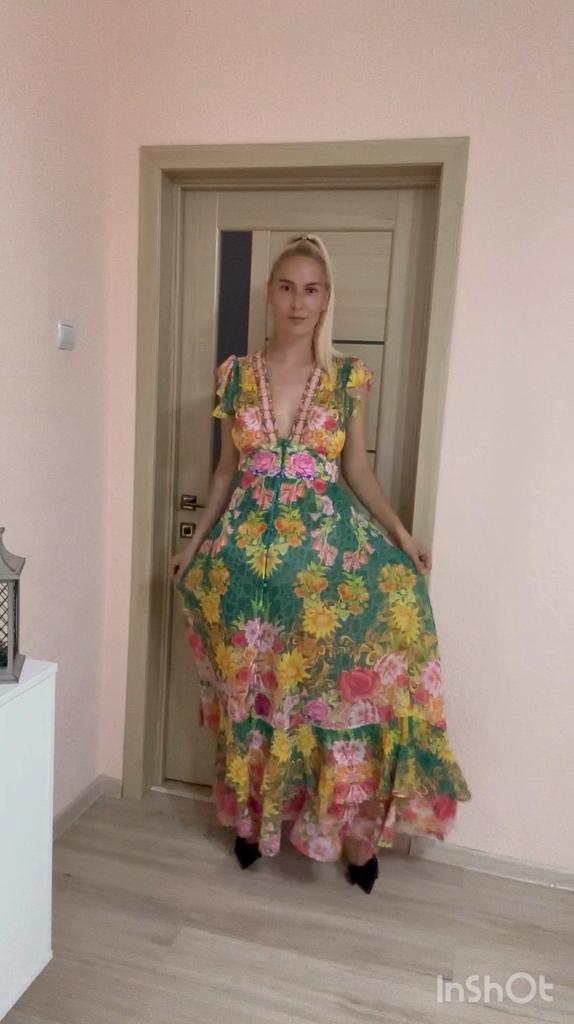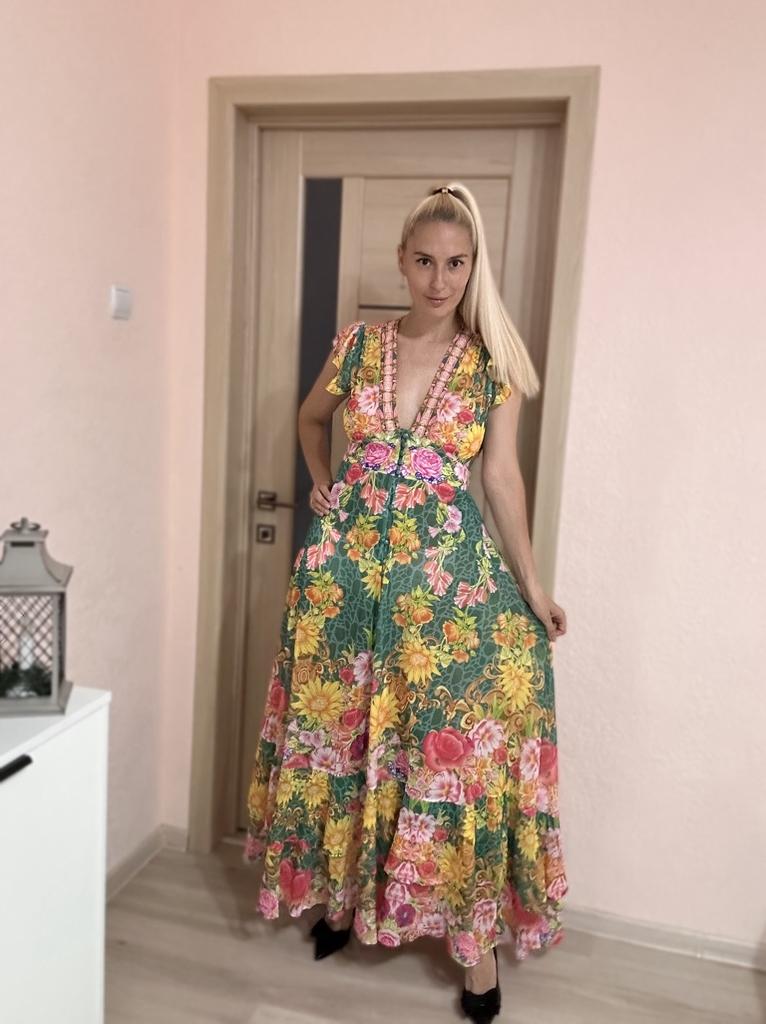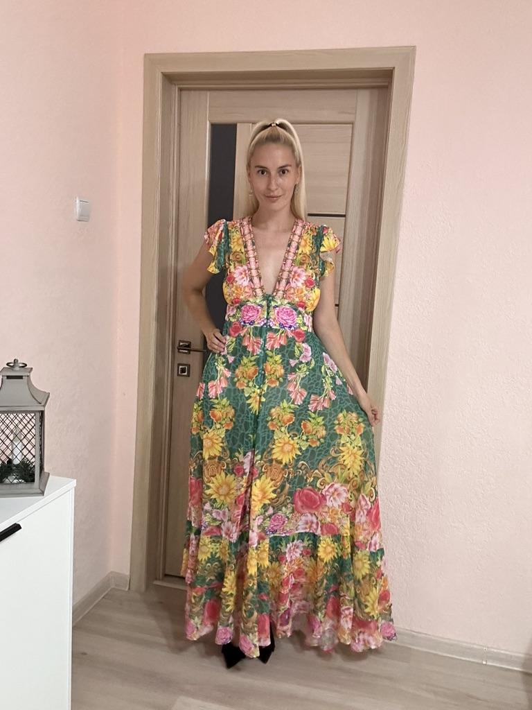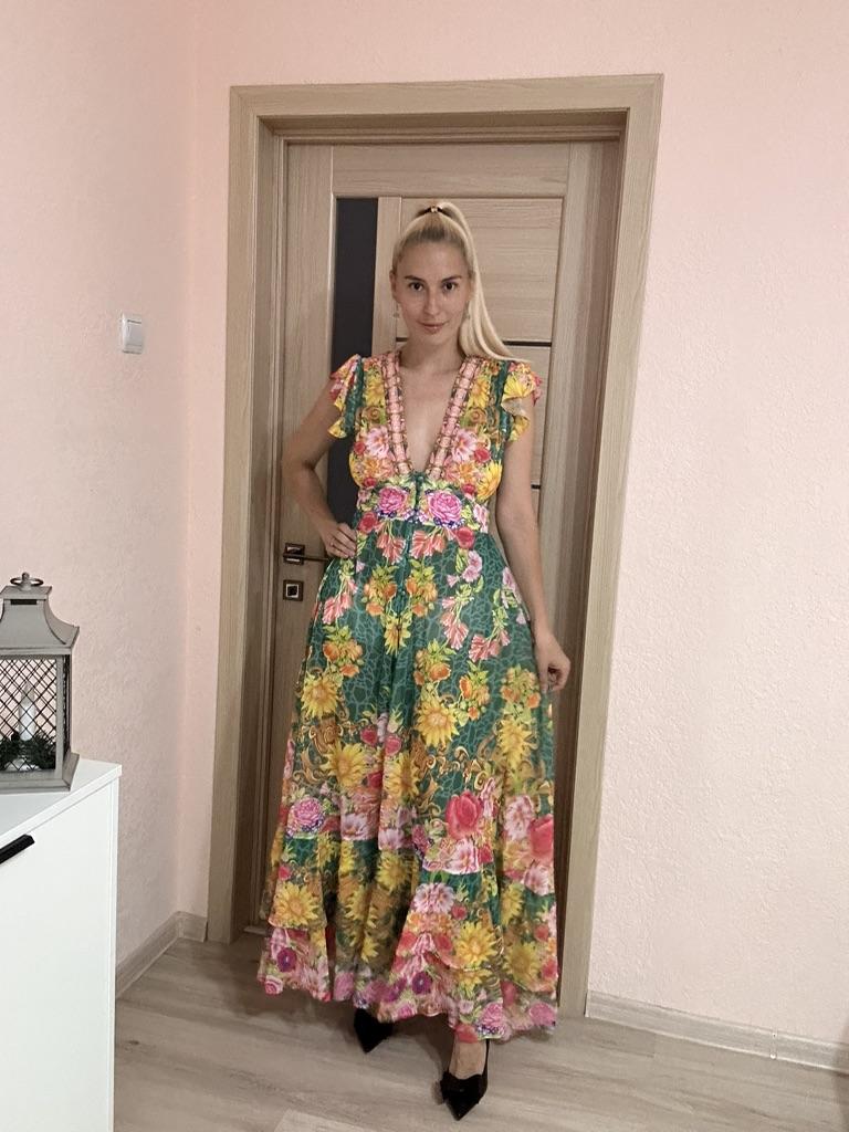 New 2024 Summer Gorgeous Flower Print Chiffon Holiday Long Dress Boho Women's Sexy Deep V Neck Sleeveless Ruffles Buttons Robe